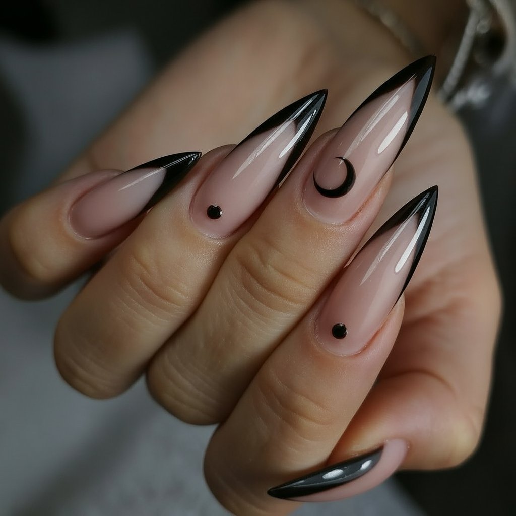 Sometimes the most powerful goth nails are the ones that whisper and not scream. These nude nails with sharp black French edges and a lone crescent are effortlessly mystical. It is the kind of manicure that screams quiet confidence-minimalist yet alluring, perfect for lovers of a clean, dark aesthetic.