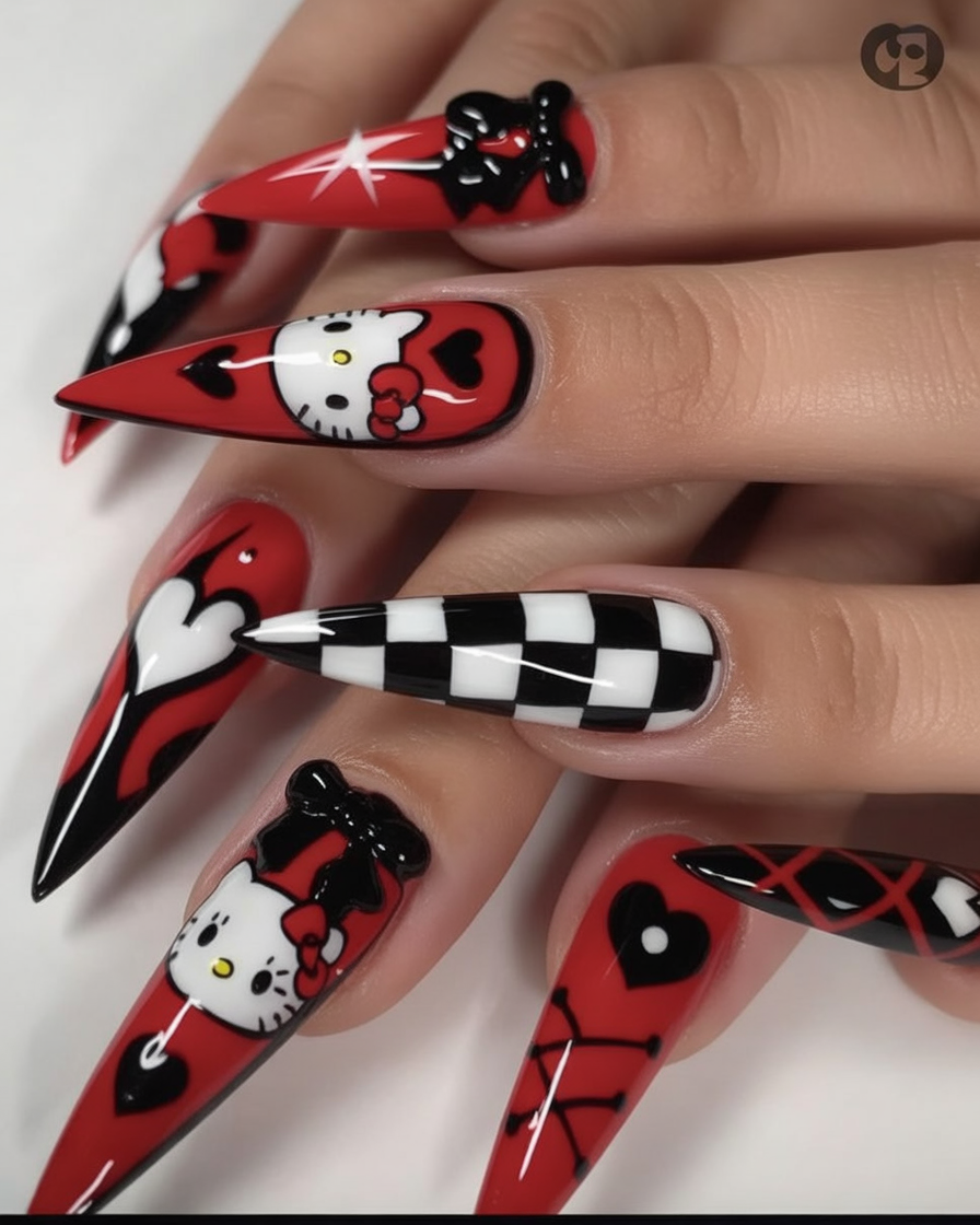 These nails represent playful dark shadows: childhood nostalgia versus goth edge. The red and black palette, Hello Kitty motifs, and checkerboard accents combine to create a totally cool Y2k-style goth vibe. It’s cute and wild, soft and sharp, innocent with guts.