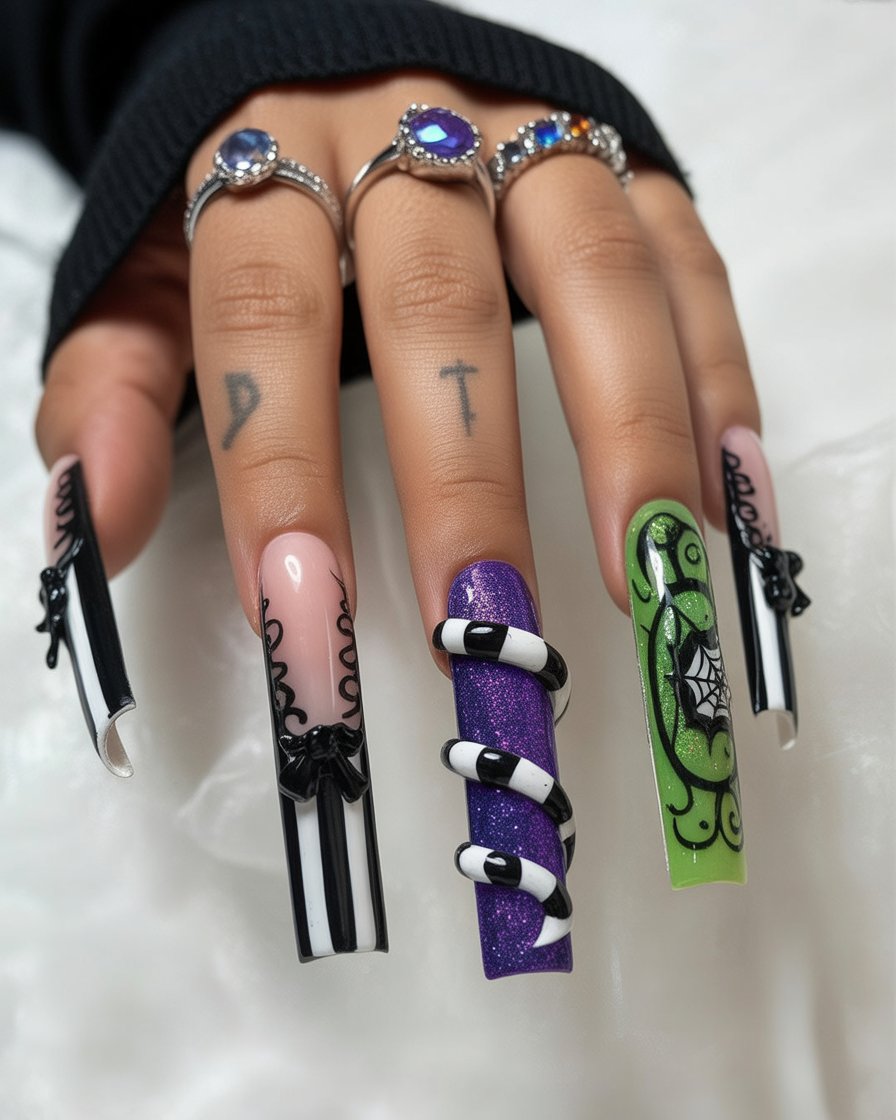 The glamorous nails are a playful and theatrical interpretation of goth, combining purple sparkle, green shimmer, and black-and-white stripes in an extraordinarily cinematic manner. Campy, fun, and flamboyant, it is the ultimate ode to gothic whimsy. That said, the 3D additions and ribbons add character and charm.