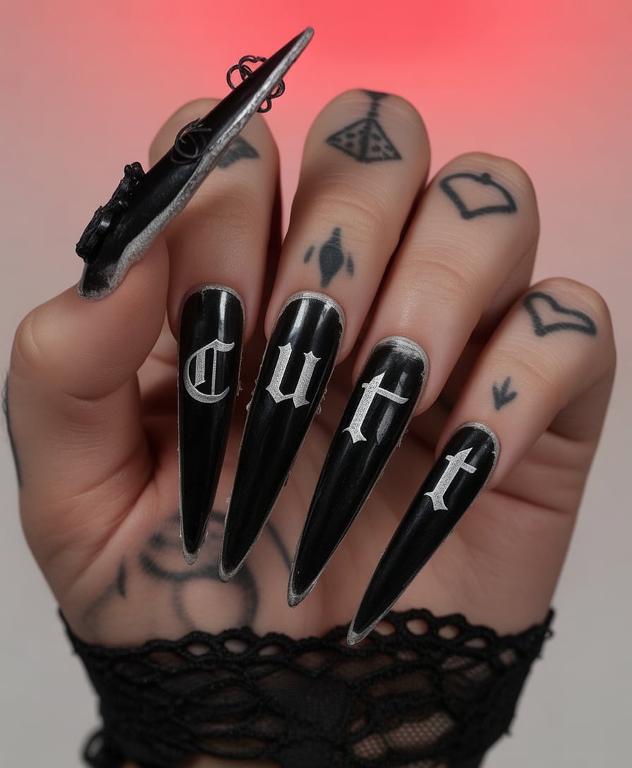 Nothing says fierce like these long Black nails with gothic lettering. They’re unapologetically bold and dripping with attitude, channelling that rebellious spirit of punk and grunge. The pointed shape just makes their attitude louder while the glossy finish keeps them sleek and commanding.