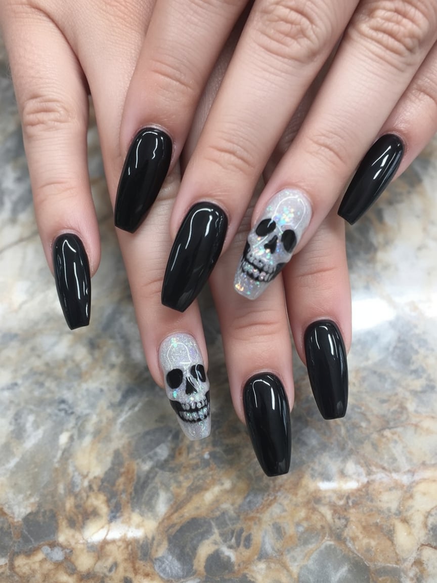 A true goth classic with a modern twist — glossy black coffin nails paired with holographic skull accents. This design screams confidence and rebellion, giving off that moody yet glam aura. The skull gives a grunge touch to the reflective sparkle, which keeps them away from gloom.