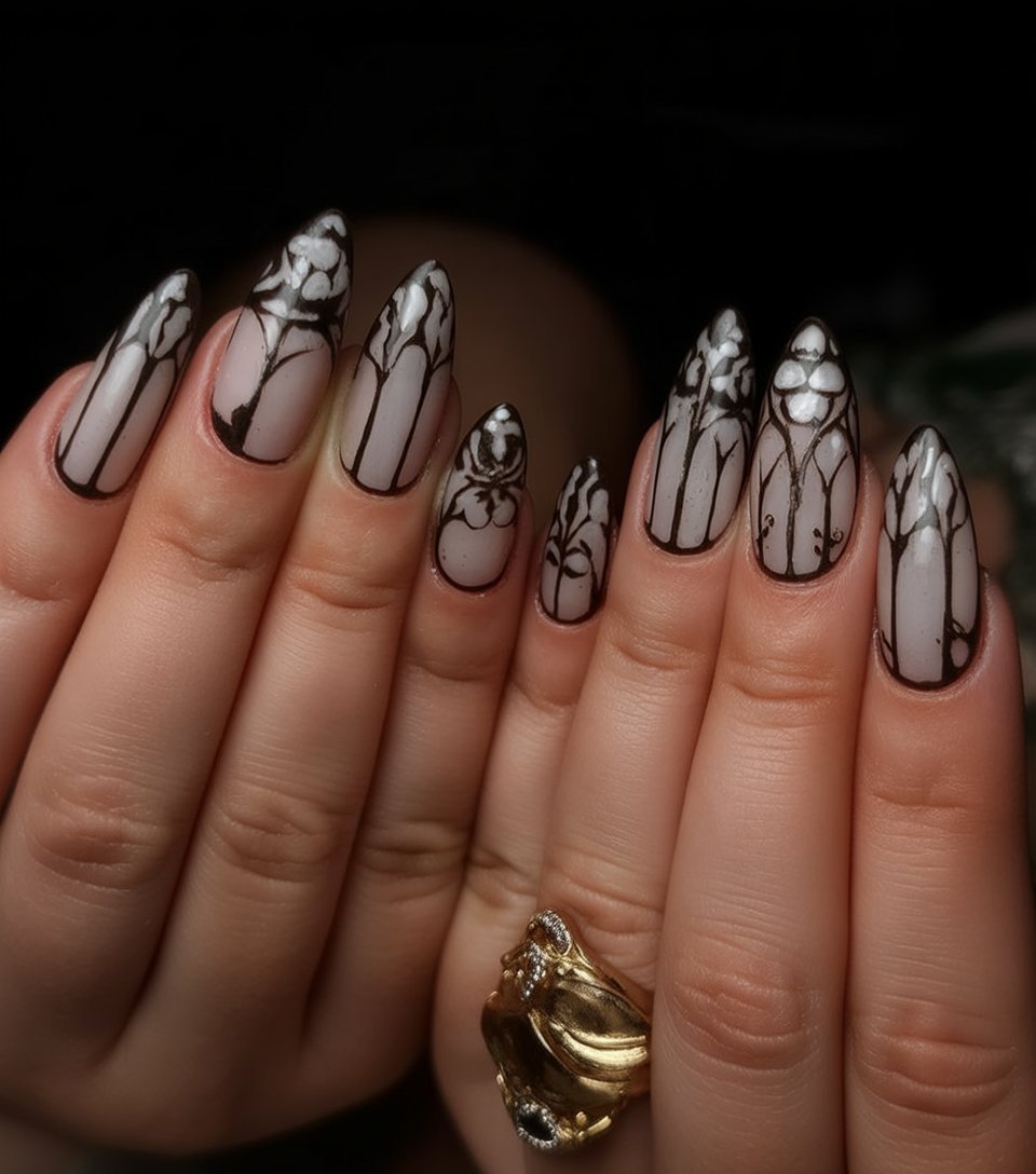 Almond shapes perfectly suit this design for medium-length nails. Nail art lovers enamored with storytelling designs will find the neutral and black combo suitable for every season. It can be easily recreated with nail stickers or a thin detailing brush. A creative way to display your dark romantic side.