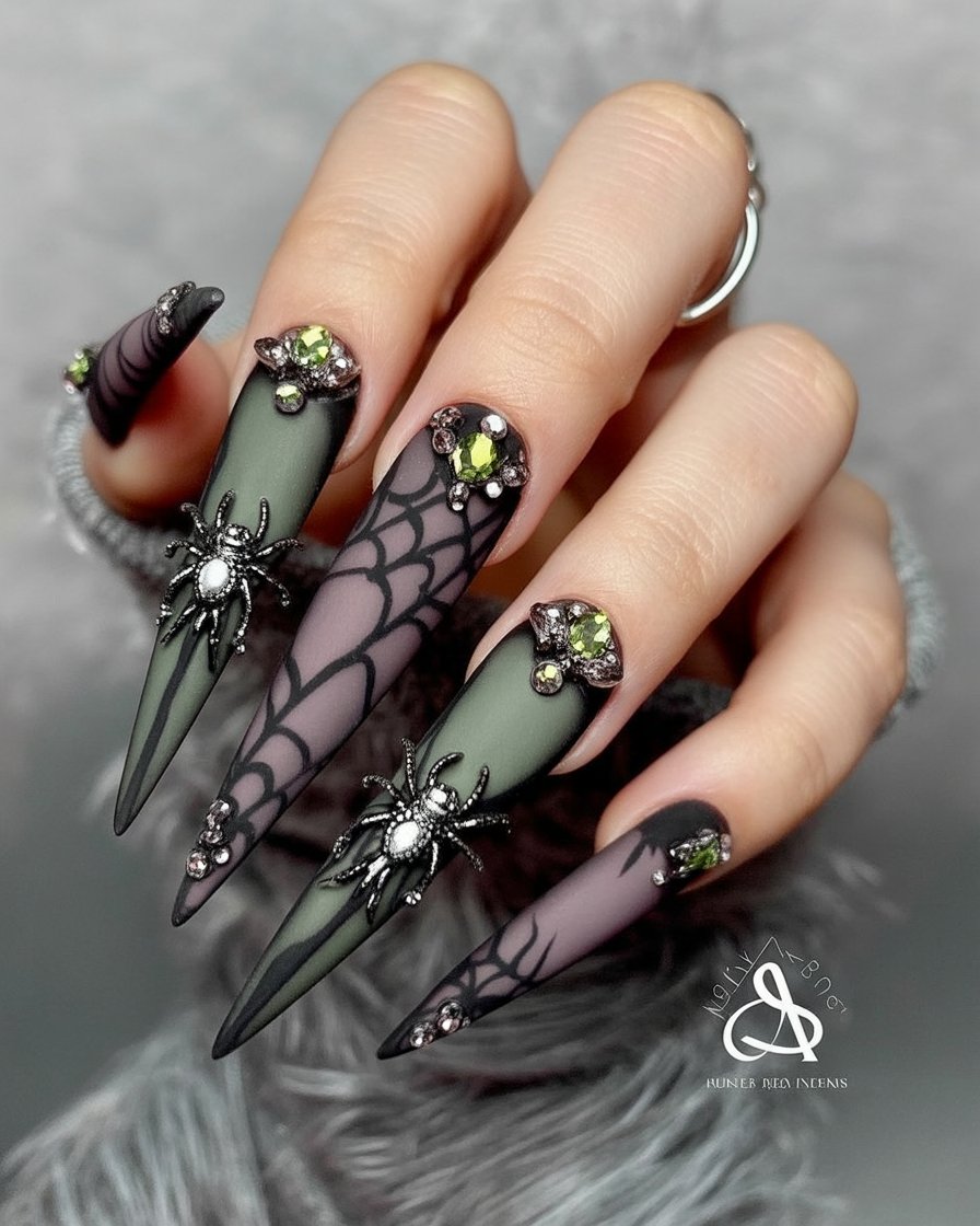Extra-long acrylic nails like these are for the stand-out type. A matte finish gives its dusted yet strong aura, and spider embellishment adds texture and drama. These nails go well with silver jewelry and black velvet — definitely one to try for confident ladies in love with making an entrance.