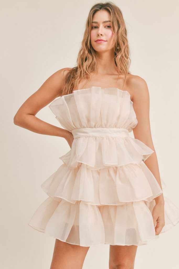 For a whimsical twist, step into your party in an ivory tiered ruffle dress. This soft and romantic choice whispers sweet elegance and is suited for a birthday girl who loves a mix of playfulness and sophistication.