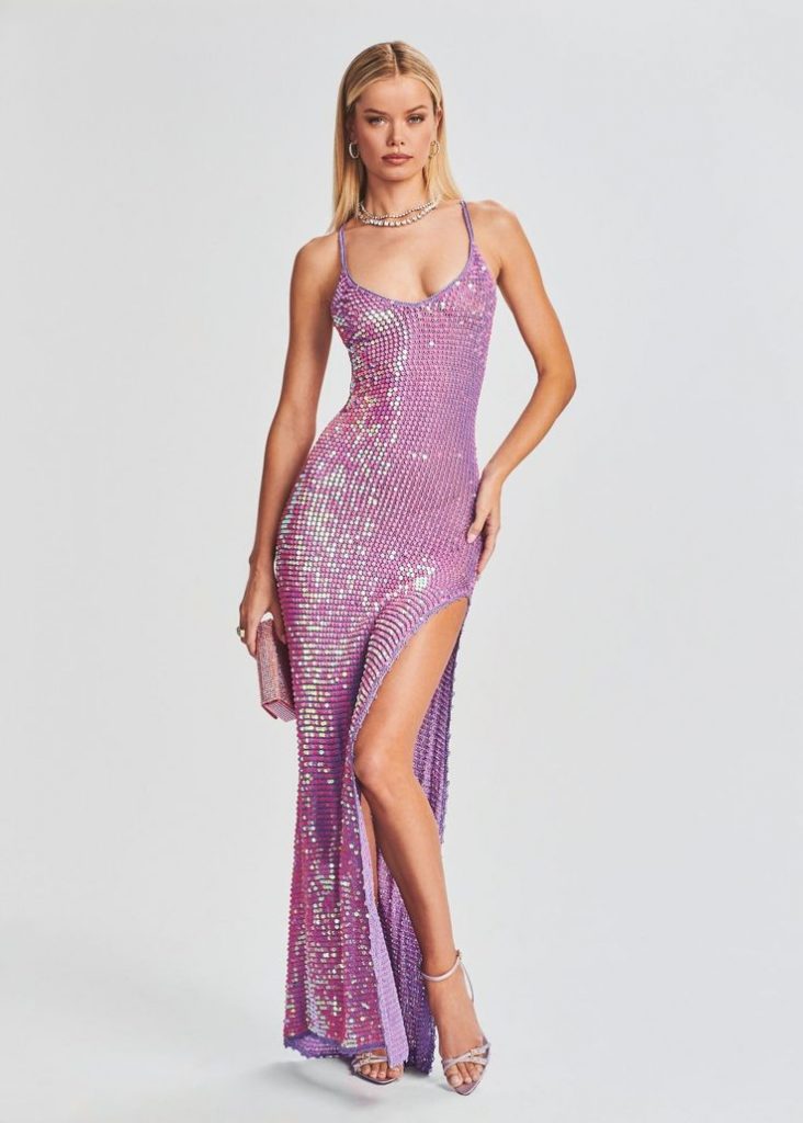 Purple is the color of royalty, and a long, slit dress in this regal hue can make you feel like a queen on your birthday. Embellishments like sequins add a modern twist, making it a perfect choice for a sophisticated evening event.
