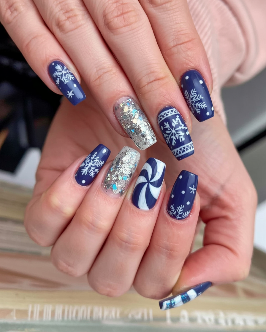Square or coffin shapes make this look stand out, giving enough room for all the detailed art. If you’re heading to Christmas parties or want your nails to be the highlight of your outfit, this design won’t disappoint. The combination of dark navy, icy white, and silver glitter makes it versatile with both casual sweaters and glamorous evening dresses.