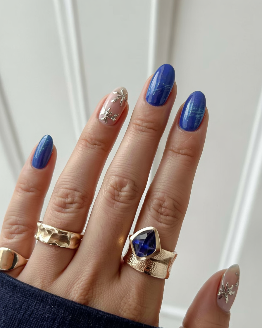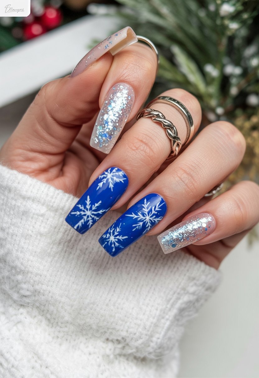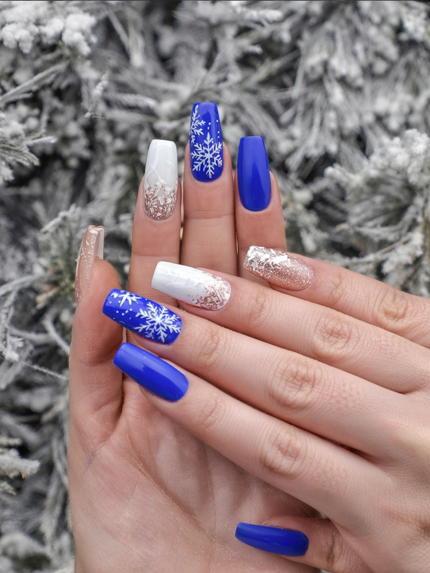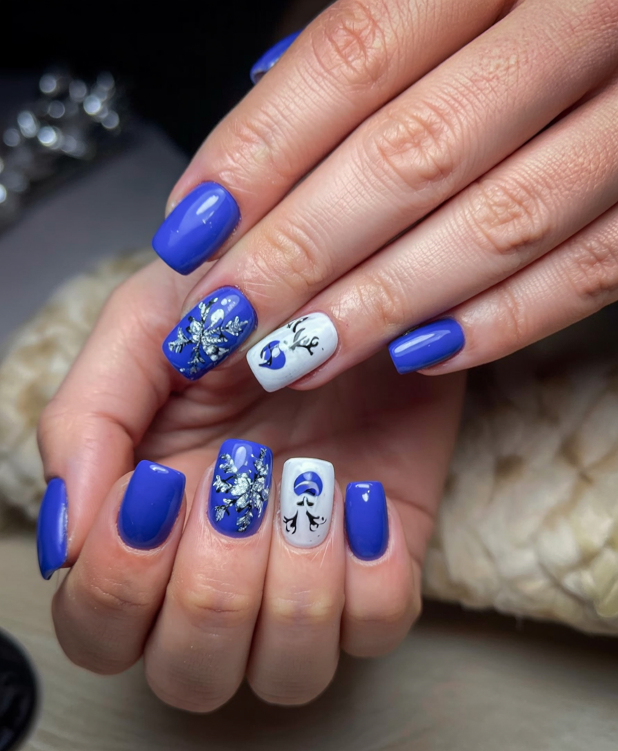 There is something very chic about going for simplicity: royal blue nails with metallic snowflakes as an accent. This design feels modern and clean, perfect if you are not into overly detailed art but want that winter sparkle. The pairing of bold blue with subtle accents perfectly balances everyday purpose with seasonal glam.