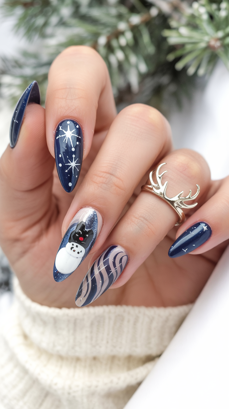 Dark midnight blue nails with starry arts accompanied by silly snowman detail have given these nails a whimsical storybook charm. The star, stripe, and icy glitter combo feels interesting and unique, perfect for someone who cracks the joke a little there.