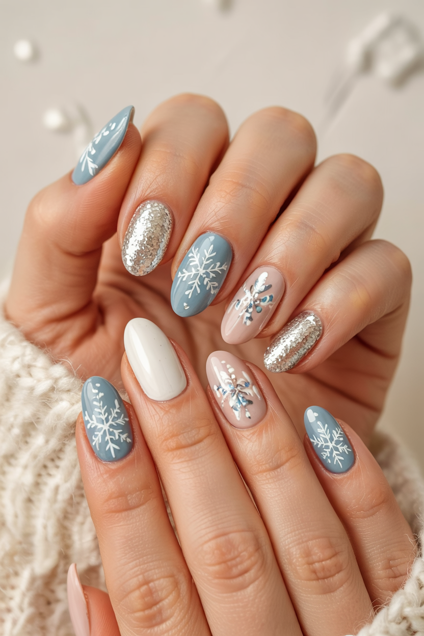 Soft blue colors blended with white snowflakes and accents of silver and glitter build a dreamy, icy aura. This set feels light and delicate and will go with the kind of manicure that whispers elegance rather than shouts for attention. The marriage between subtle winter tones and glitters makes these nails highly suitable for both holiday glory dinners and casual evenings basking by the fire.