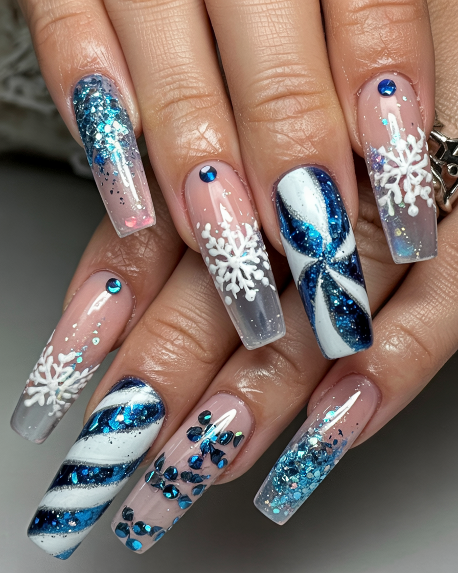 These nails resemble frosted candies straight out of a winter wonderland. The scintillating mix of icy glitter, bold blue stripes, and delicate snowflakes make for a dazzling feel that is both festive and luxurious. Rhinestone accents layer yet another sparkle, making this design impossible to go unnoticed during the winter holidays.