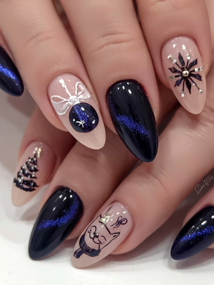 This set mixes midnight blue shimmer with whimsical holiday art — from Christmas trees and ornaments to a playful cat design. It’s fun, artistic, and absolutely unique, giving your nails a personality all their own.