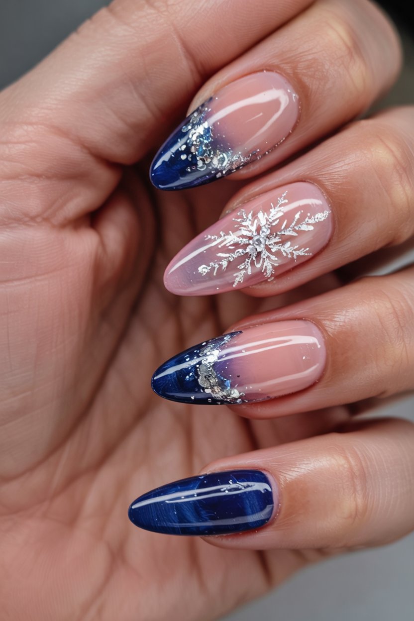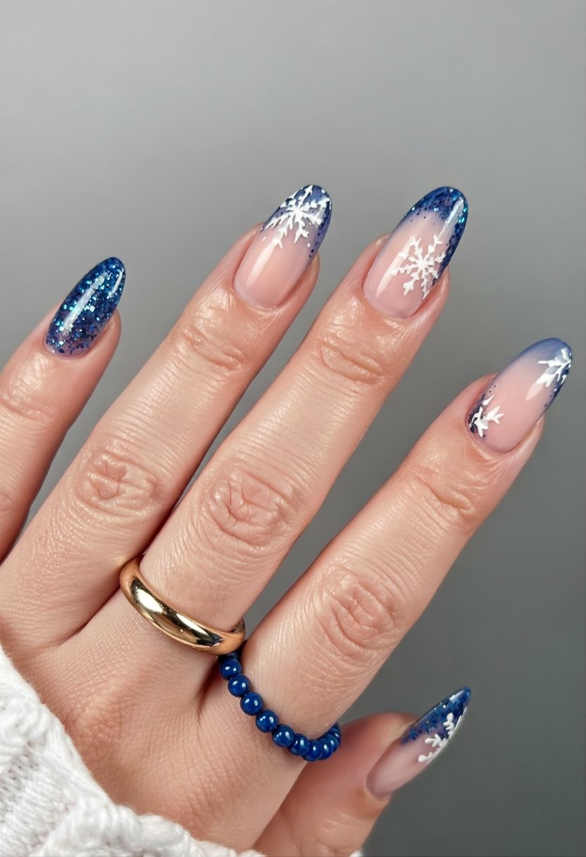 Imagine looking down at your nails and seeing a snowy night sky glitter in blue ombre. This manicure achieves that effect with sparkling tips that fade into soft nude bases, which are then adorned with delicate snowflakes. It remains glamorous yet totally wearable, making it an elegant option for going to holiday parties.
