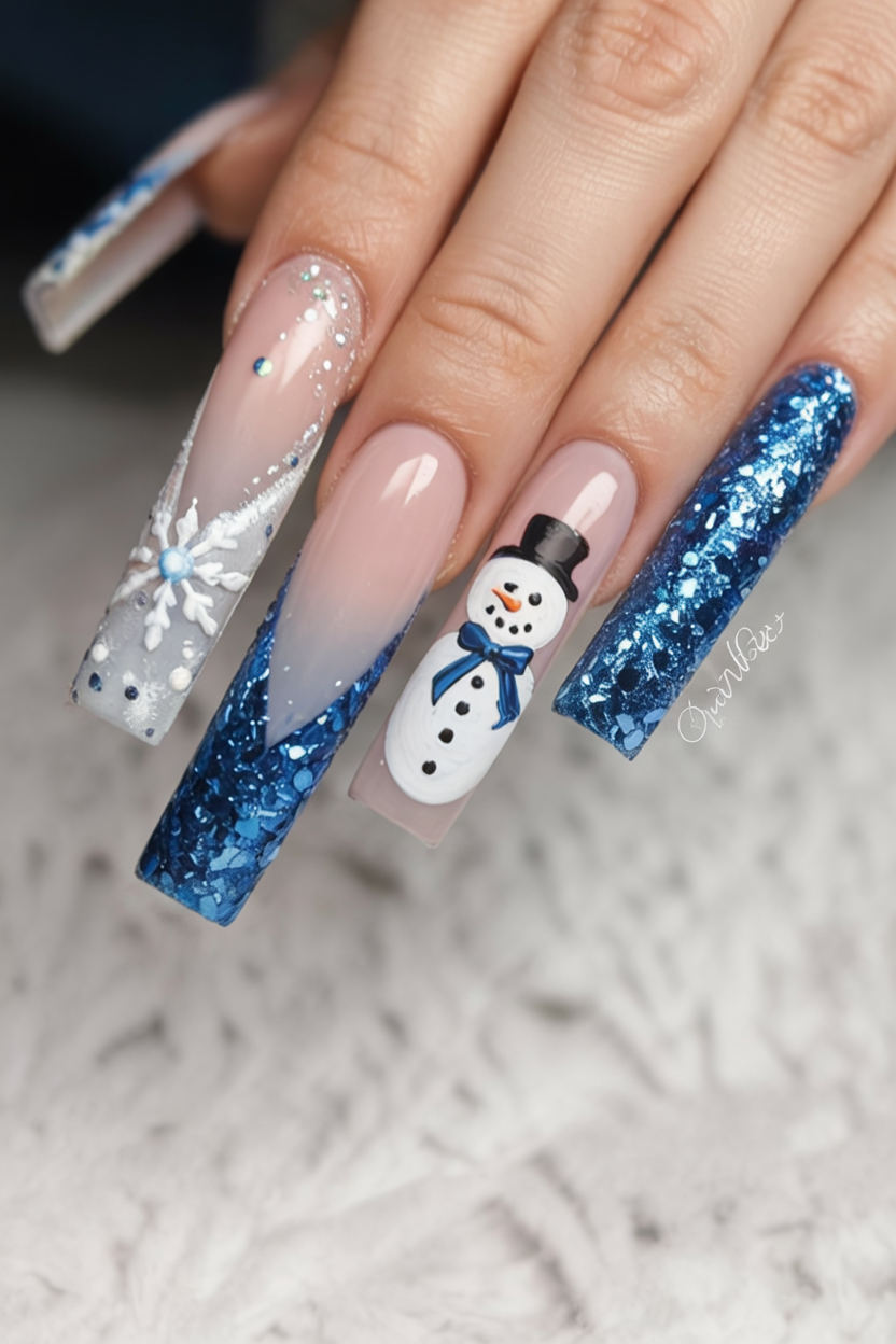 These nails are all about making a statement: extra-long coffin acrylics with blue glitter, white snowflakes, and an adorable snowman centerpiece. It’s bold, festive, and playful — the kind of manicure that instantly puts you in the holiday mood. The mix of icy blue sparkle with whimsical art feels fun while still exuding confidence.
