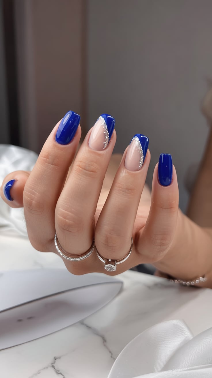 Almond nails are just there! They add femininity but leave room for creativity in detail. The design is a strong contender for holiday parties and New Year’s events. If you want nails that feel gala but not heavy at the outset, this blue-silver-nude combo is the way to go!