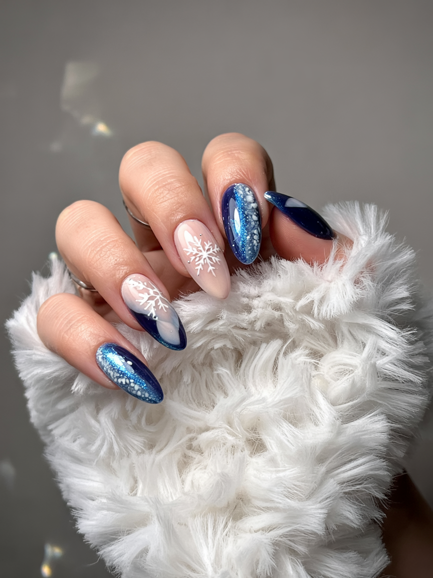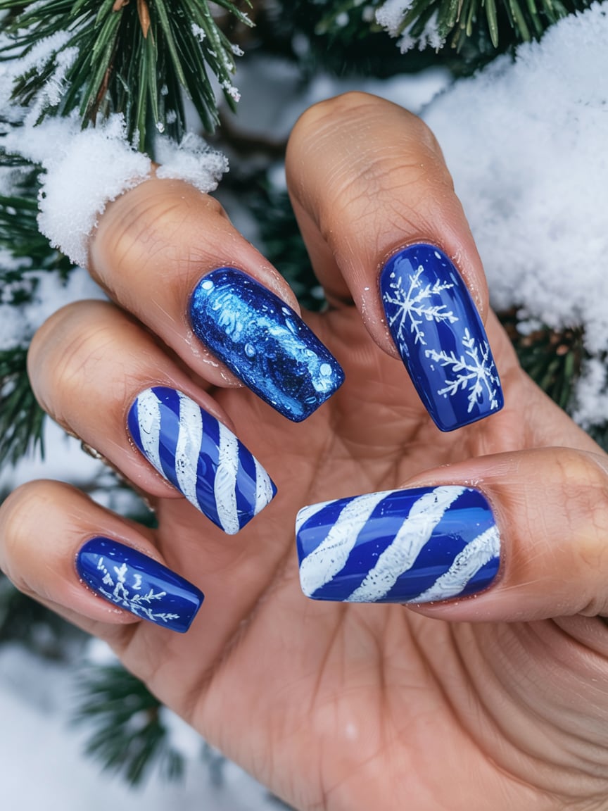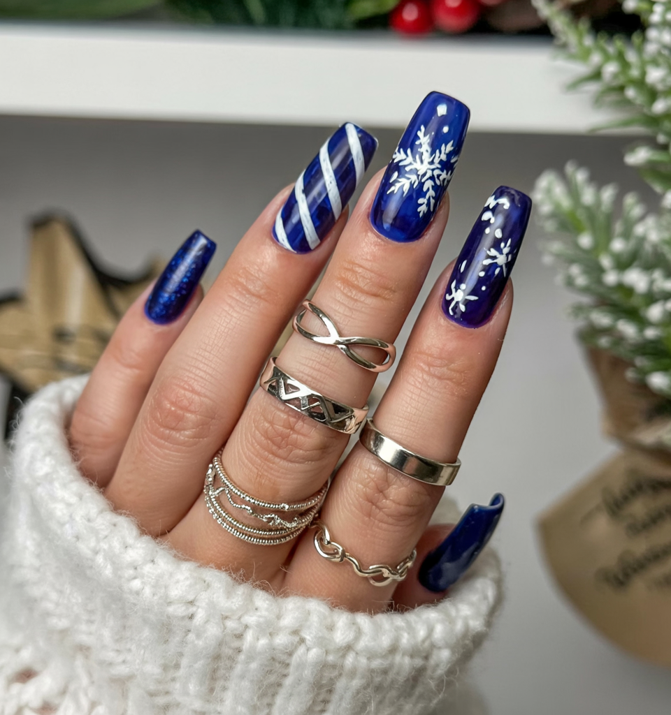 Bold navy paired with icy white stripes brings candy cane vibes to your fingertips — but with a sophisticated twist. Add in delicate snowflakes and a touch of shimmer, and you’ve got a nail look that’s festive without being over-the-top. This style is both playful and chic, the kind of design that makes you feel instantly polished while still embracing the fun side of the holidays.