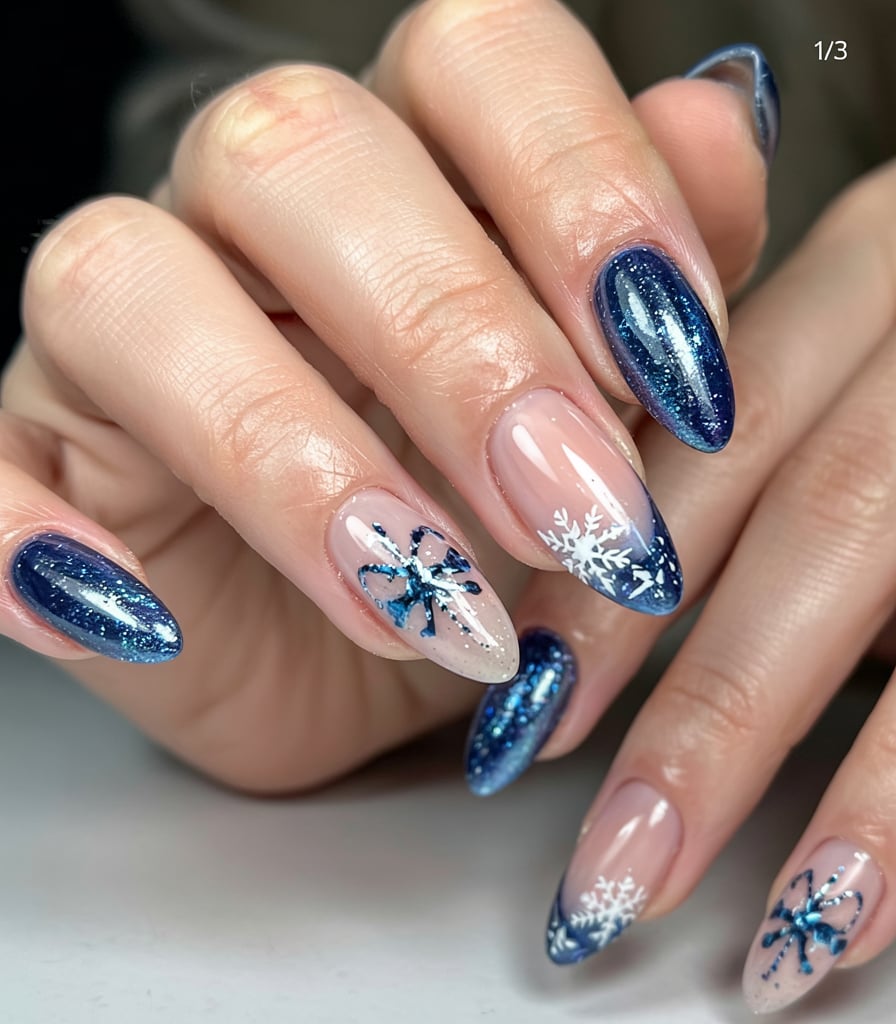 On almond nails, this design works beautifully and is well suited to women who love a combination of grace and whimsy. The glitter adds just a hint of drama while still allowing it to remain graceful, and the ombré effect elongates the fingers. It is just perfect if you want a nail design that feels trendy in 2025, yet still holds its own as a forever-winter inspiration.