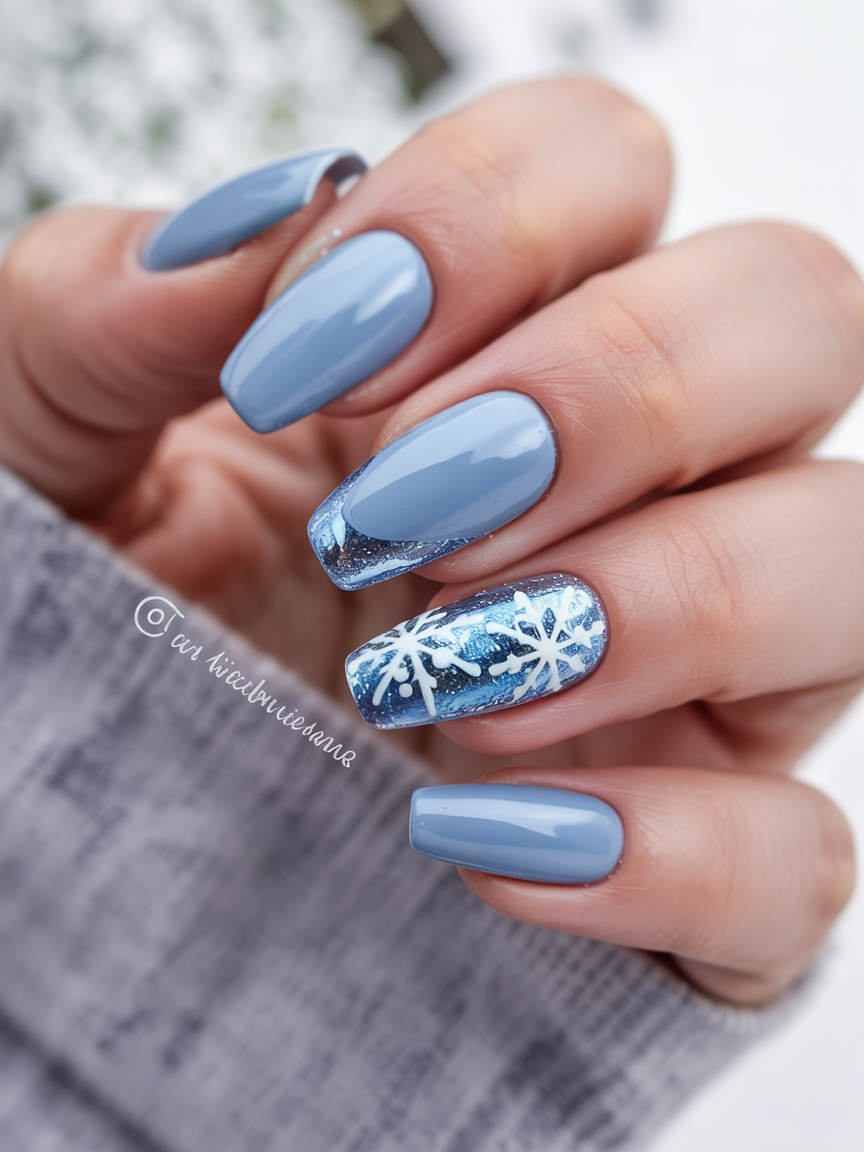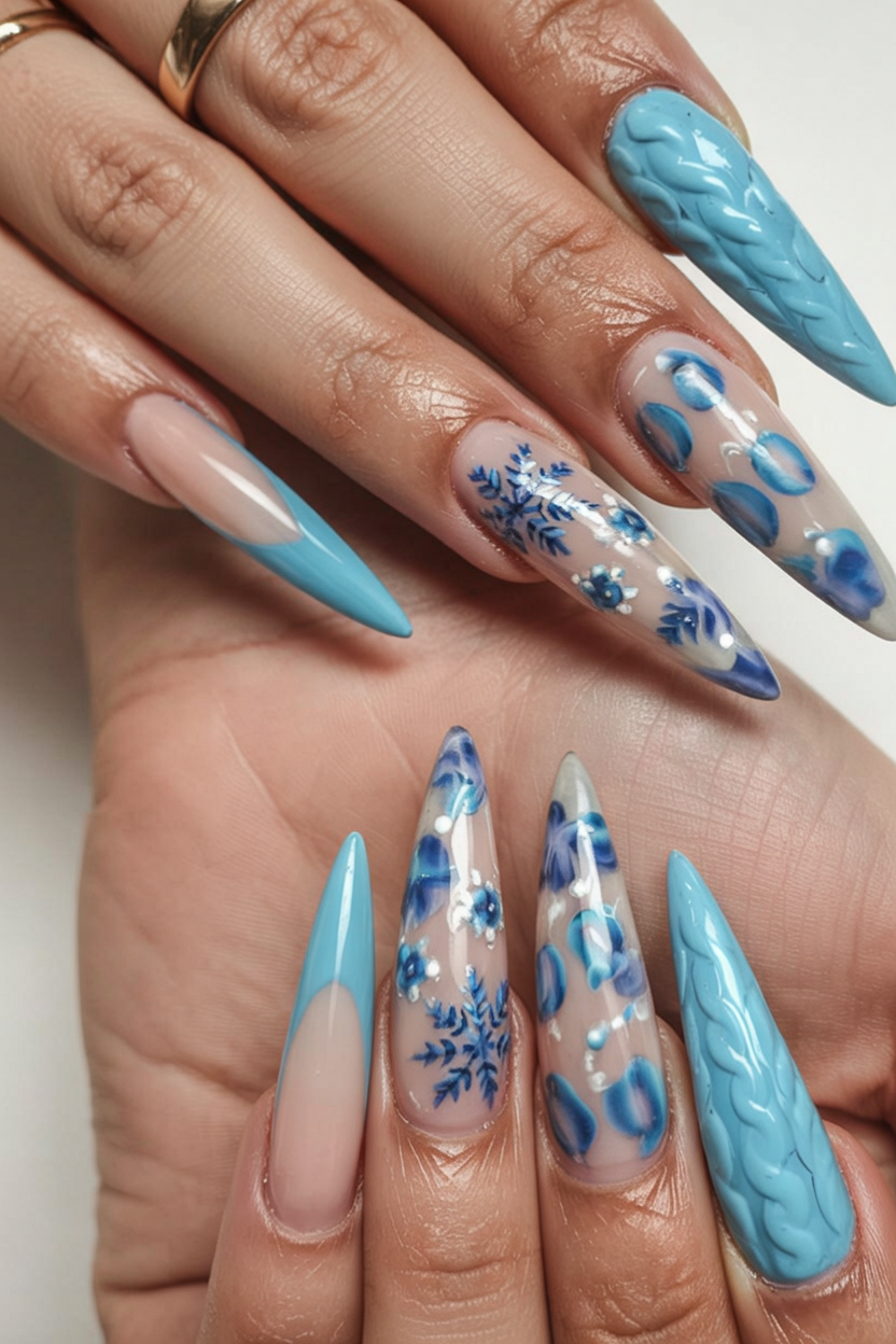 This design juggles soft powder blue tones alongside textured knit-like effects and delicate floral dinosaur snowflake art. It posits a bit of a playful tease yet has its share of elegance, thus rendering it worthy for the nails if you adore nails that feel trendy yet cozy for winter. The split between icy tones and the artsy design conjures frosted windows and warm sweaters by the fire.