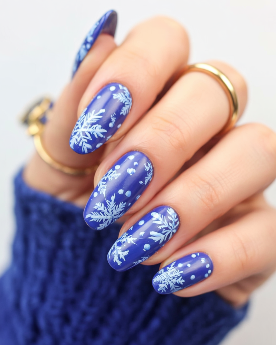 Nothing beats classic blue nails with white snowflake art in the timelessity department. It is one of the go-to looks for winter celebrations, giving a splash of joy straight to your fingertips. Snowflake details pop out magnificently against a royal blue background creating both warm and stylish vibes.