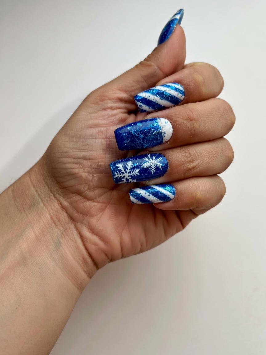 Deep blue nails with candy cane stripes, snowflakes, and glitter make for a playful, festive style. That design screams winter holidays, with just the right amount of sparkle and fun.