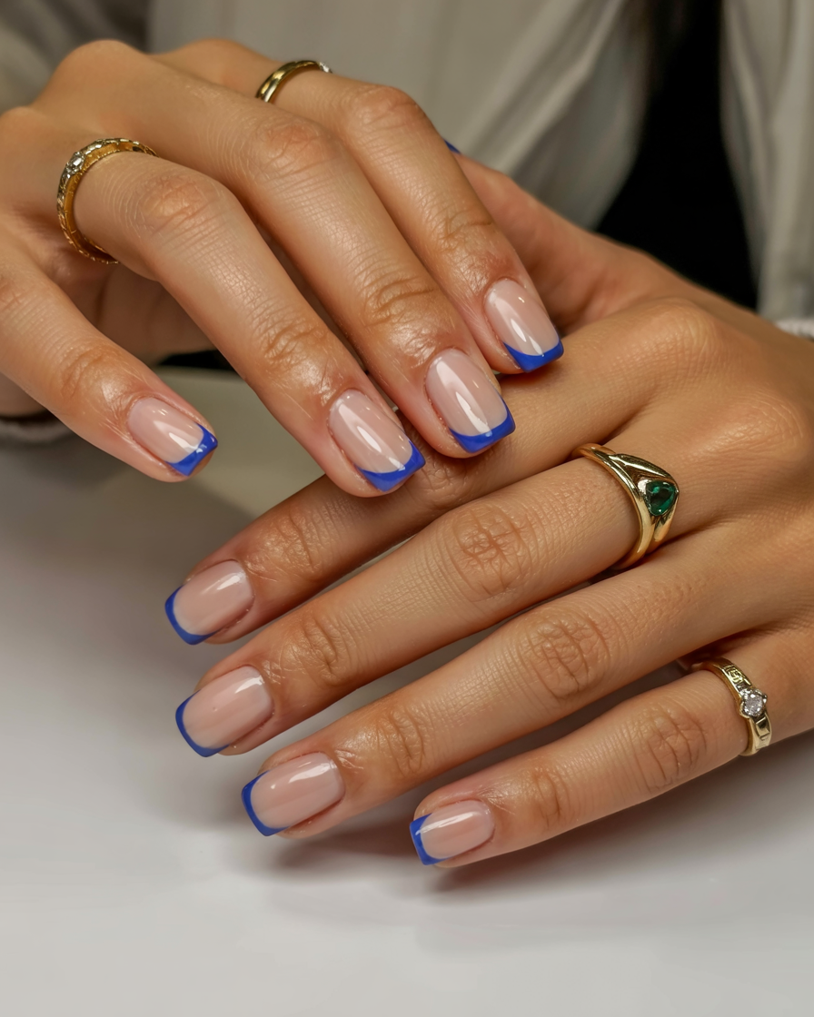 Here’s proof that you don’t have to have extremely long nails to rock blue French tip nails as cool as these gorgeous designs for 2026. Short and slightly squared tips feature only a subtle stroke of cobalt blue right along the edge, just enough color that you can’t help but crack a bright smile every time you extend a thumb up and aim for happiness. To maintain this look, stick to easy beauty practices, keeping nails shaped into a subtle square and ensuring that the free edge is trimmed low enough that typing and texting remain easy on your hands and keyboard. “A hydrating cuticle oil and a weekly quick hit of topcoat can help keep that thin blue stripe looking slick and shiny,” says Mary Soanes, a London artist and beauty insider. “It’s perfect for people with active lifestyles or who work on their feet or hands all day who still want a little hit of navy blue on their fingertips.”