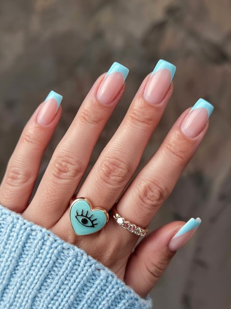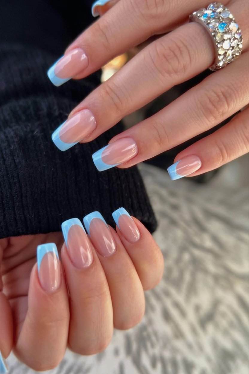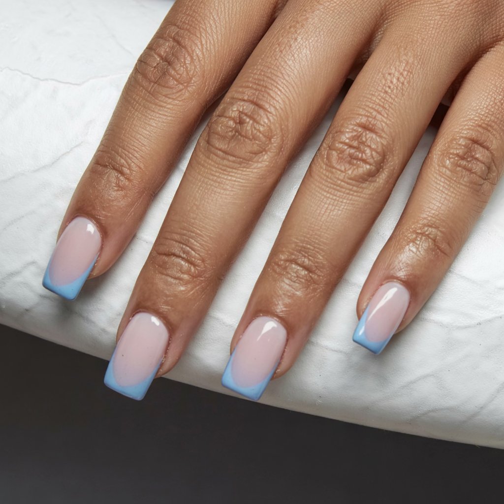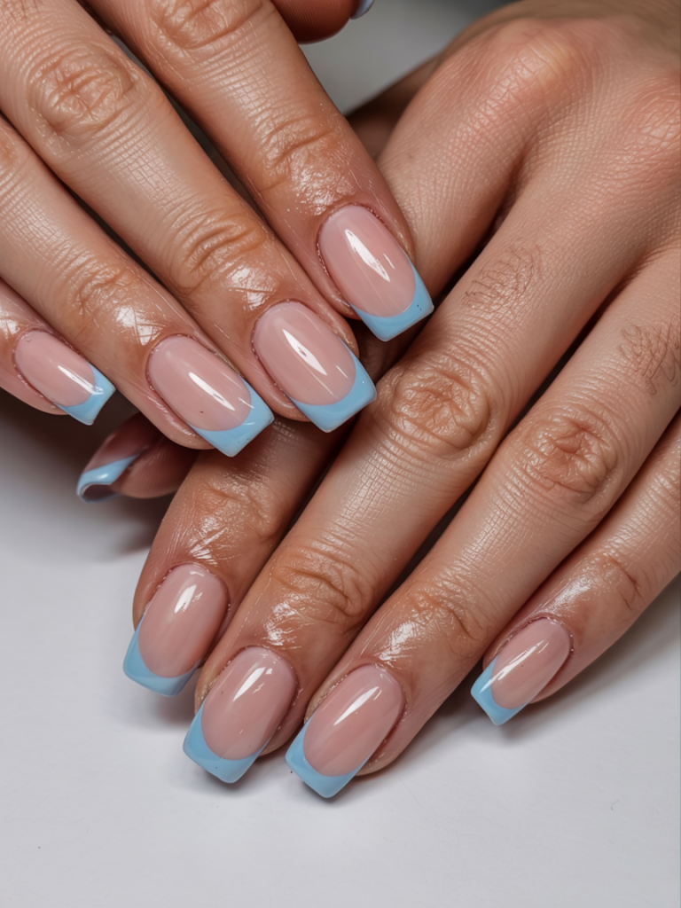 These longer square nails wear a generous band of light baby blue across the tips, almost like a little color block on each finger. The contrast between the soft nude base and the cool sky shade feels fresh, modern, and just a bit youthful in the best way. It’s the kind of manicure that makes you want to book brunch, take pictures, and wave your hands around a little more than usual.