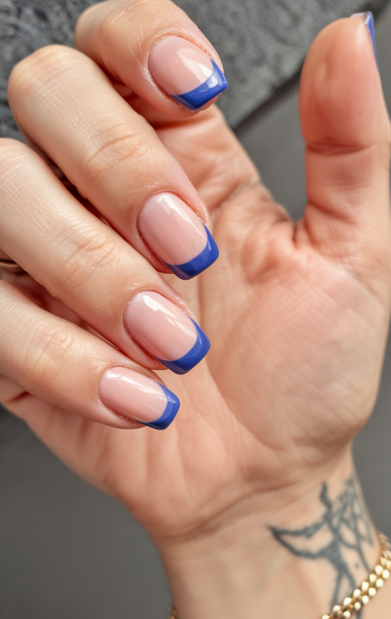 In this example, a classic French tip has been curved slightly and made a little thicker, offering a statement stripe of deep blue on each of your nails’ edges. It is quite a statement design if you like well-cuffed jackets, sharply defined handbags, and clean, geometric silhouettes in your wardrobe choices.