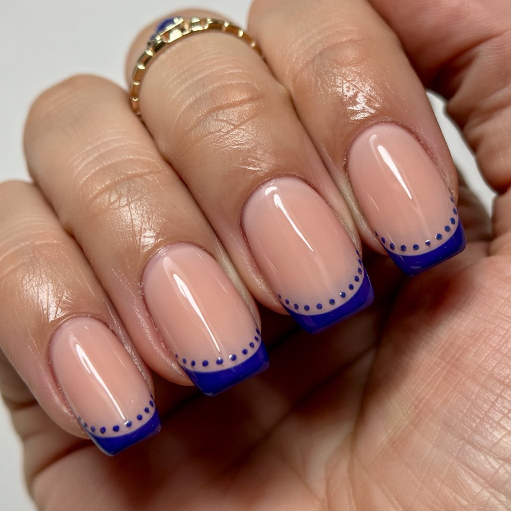 If you are a fan of blue French tip nails, then this is the perfect little French tip design for you because it gives this popular trend of 2026 a very mature and sophisticated makeover. The nude color is one that is quite gentle and pretty, and only that little blue dotted edge—well, that is just enough quirky to pass as ‘cute’ without trying too hard or standing out too much.