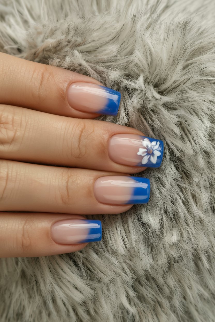 Actually, this design is just about as close as you can get to having a mini-vacation on your nails that still looks cool and consistent all at once. Even though it is kind of a romantic and feminine theme, because of that one flower-crowned nail, it never comes across as too tacky or over-the-top, and it easily could be rocked from a brunch date on the weekend through an evening on the town, as well as some blue French tips that incorporate this fade effect.