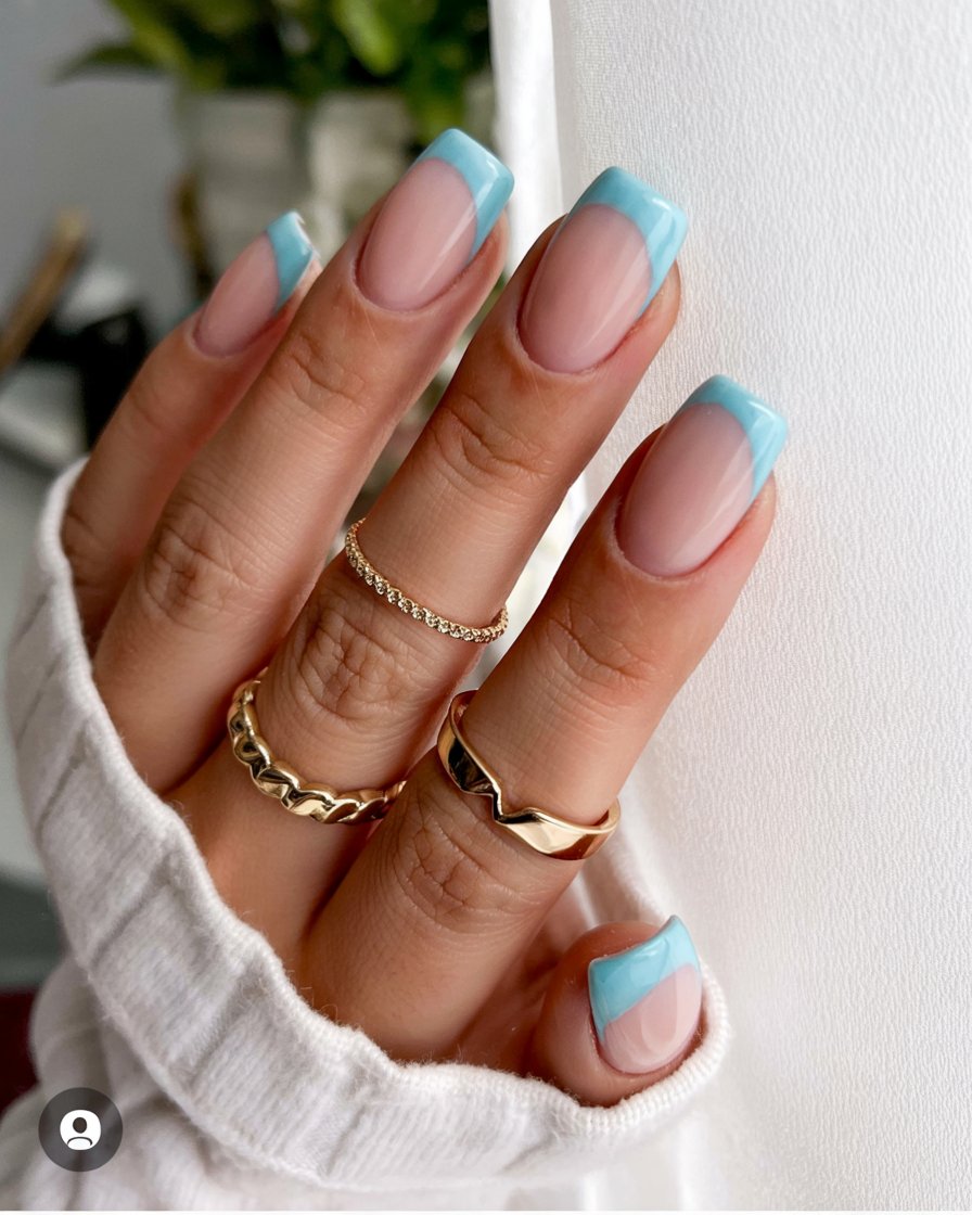 If you prefer your blue French tip nails toned down a bit, then this utterly dreamy pairing of nude and soft baby blue is like the reflection of sky on water—it’s intoxicating, ethereal, and otherworldly beautiful! It dilutes the classic French tip design and gives your hands a refreshing, laid-back appearance that exudes polish without screaming it from the rooftops—this is perfect for days when you want your nails to whisper, not shout!