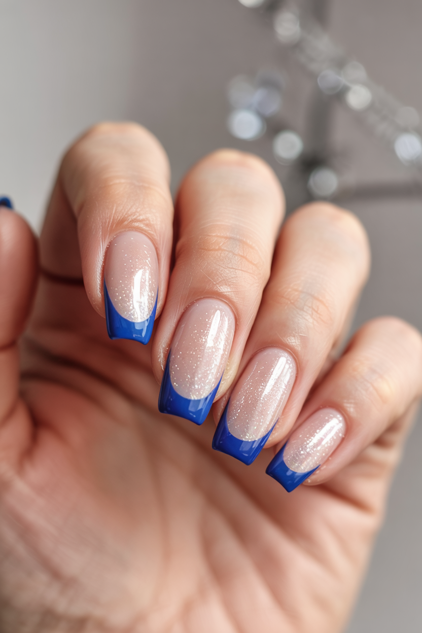 These square nails combine a sheer, slightly shimmery base with glossy royal blue tips, and the effect is pure evening glamour. The sparkly veil over the nude base catches the light softly, while the solid blue edge keeps everything grounded and sophisticated. Think cocktail-hour nails that still feel perfectly fine for Monday morning meetings.