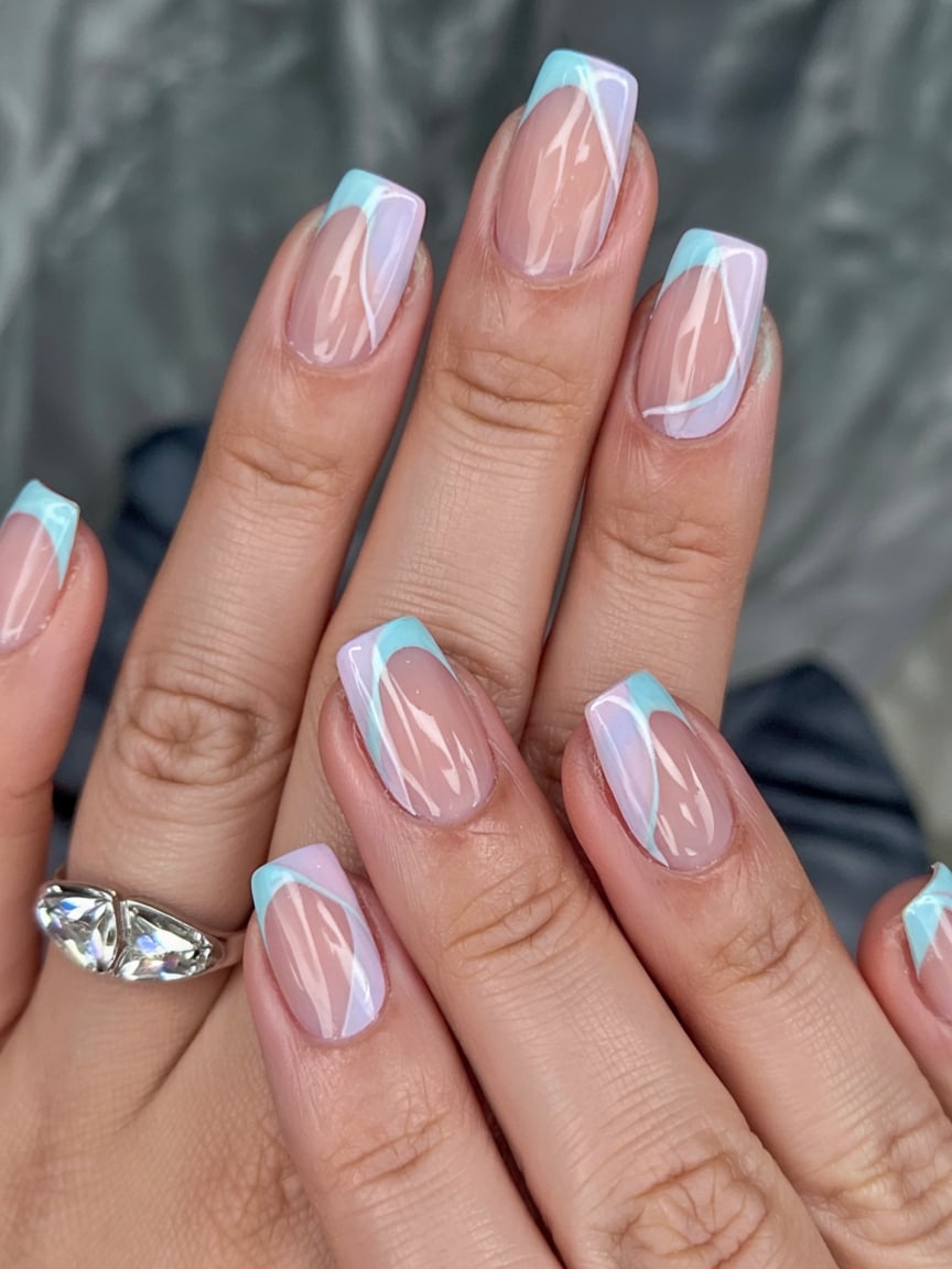 Even blue French tip nails can be mini-masterpieces thanks to this design, as pastel colors of light blue and lilac swirled through a cloudless blue sky swoop into curved, abstract twists of color on these tips, symbolizing movement and airiness as they lack any kind of linear definition, offering a sophisticated take that’s not quite busy despite all of that color and artistry involved.