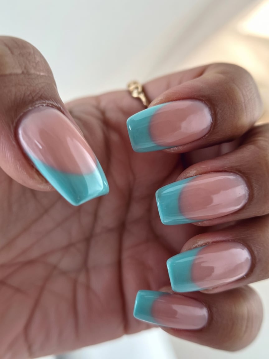 These nails have this cool sea glass appearance, and all they can get you into is a vacay mood as soon as you lay eyes on them. You get this shiny nude finish that just flows into this turquoise blue stripe that is just soft enough for you to call it pastel, though still bold enough that you can call this one of a kind and entirely on its own, one of a kind and truly statement-making on its own right. This one is blue French tip nails 2026 for that woman who is nothing but a neutrals fanatic and still clamoring for some sky and some sea elements thrown into this deal as well. “This style is great if your nails are on the thicker or stronger side, whether natural or acrylic.” (This style is great if your nails are on the thicker or stronger side, whether natural or acrylic.) ”If you have longer nails, you can be bold and go all-out, emphasizing that rounded edge of color without worrying about it overwhelming your hand, and this smooth blue is perfect whether you have lighter or darker skin.” (If you have longer nails, you can be bold and go all-out, emphasizing that rounded edge of color without worrying about it overwhelming your hand, and this smooth blue is perfect whether you have lighter or darker skin.) ”Opt for a high-gloss finish and have your technician create a slightly curved transition line instead of a straight one, and this color will pop through every gesture.” (Opt for a high-gloss finish and have your technician create a slightly curved transition line instead of a straight one, and this color will pop through every gesture.)