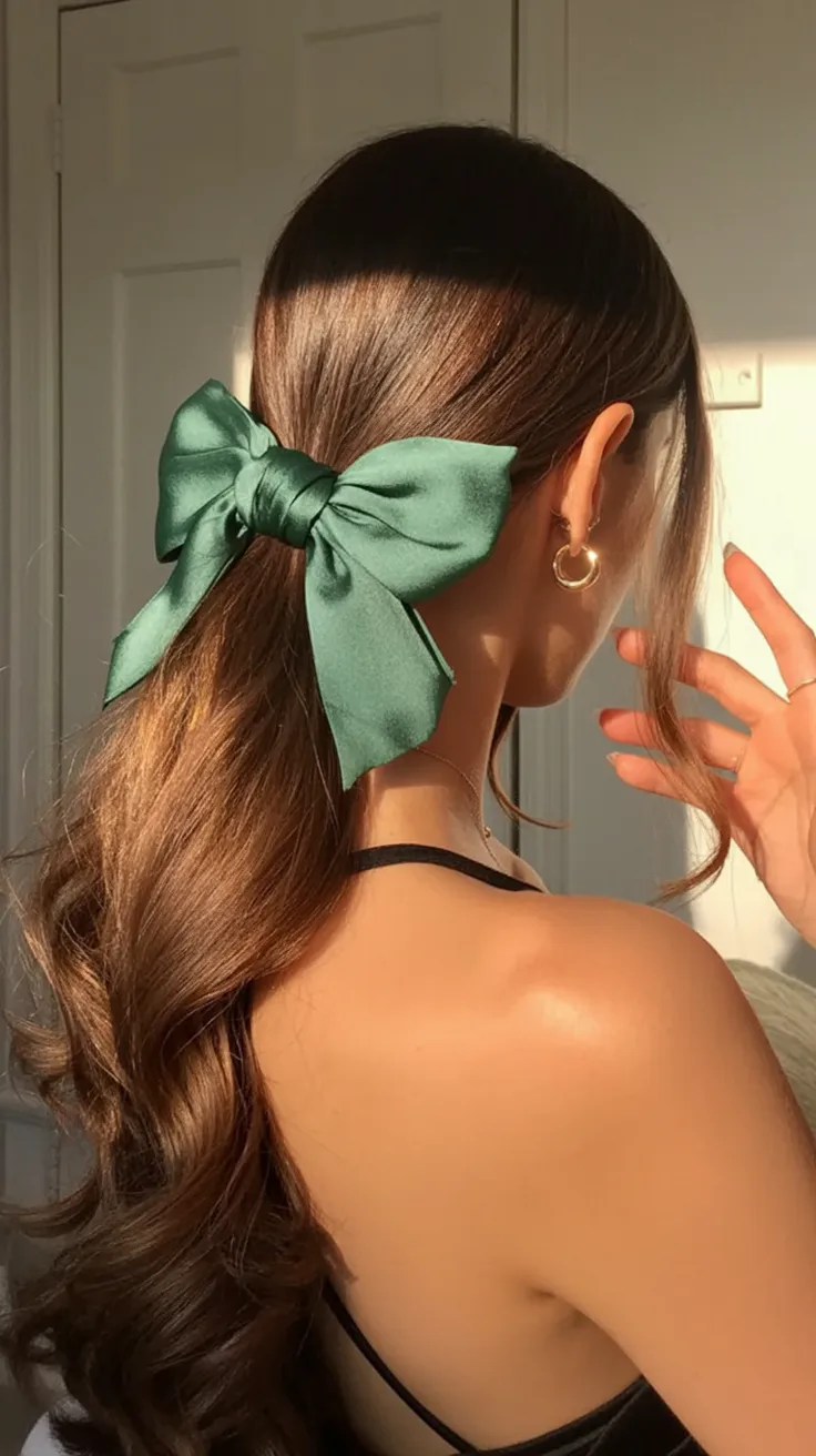 This hairstyle has such a rich, confident feel to it. The smooth crown, the glossy ponytail, and that deep green bow create a look that feels polished, feminine, and quietly luxurious. It is the sort of style that makes you stand a little taller the minute you put it on. The shine in the Hair and the softness of the curled ends keep it from feeling flat, while the Ribbon adds just enough personality. Honestly, this is one of those 2026 bow hairstyle ideas that makes an evening look feel finished in seconds.