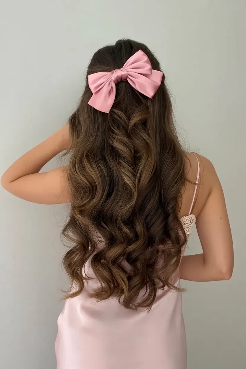 21. Soft Glam Half-Up Curls with a Pink Bow