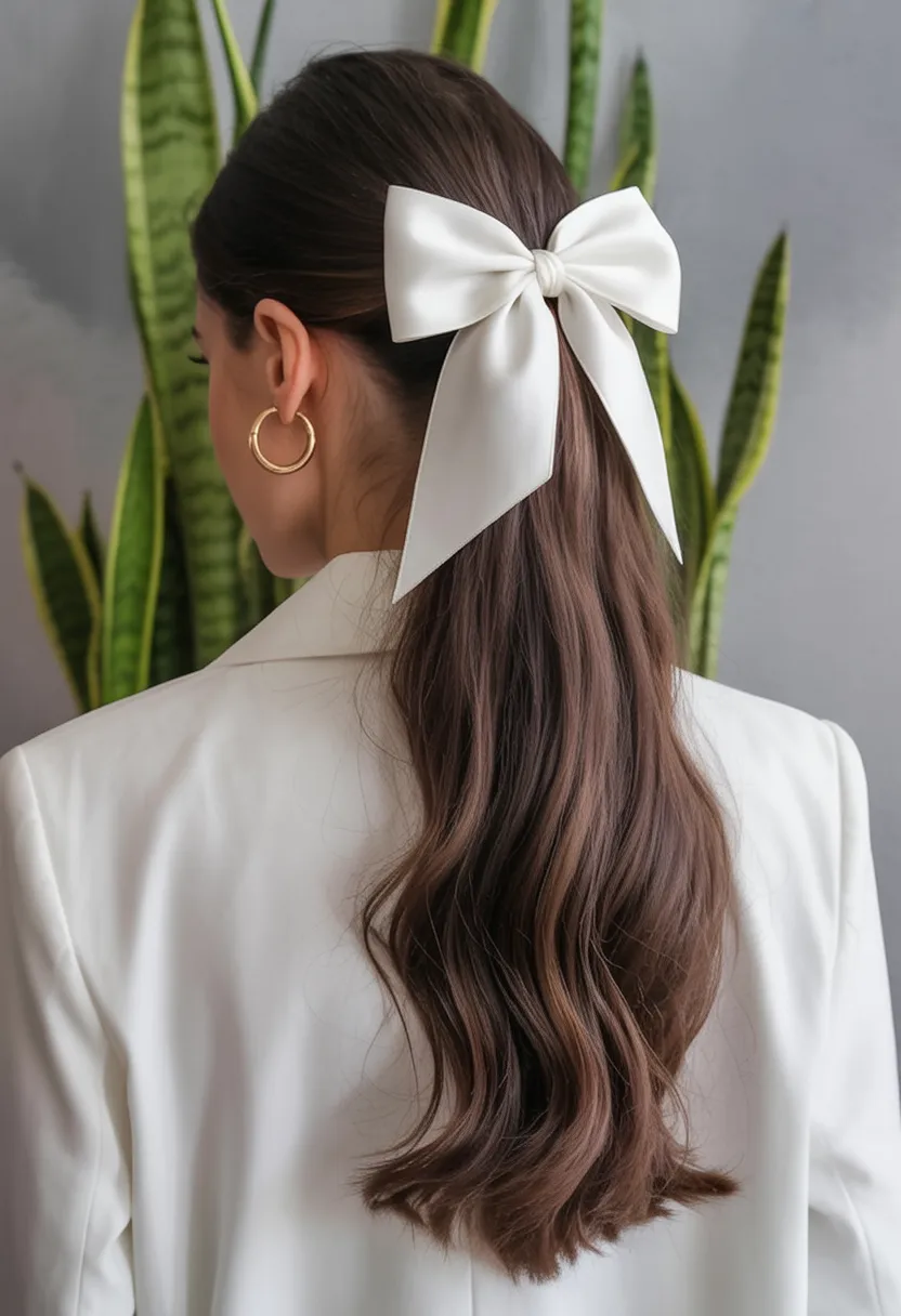 This is the kind of style that whispers elegance instead of shouting for attention. The smooth low ponytail, the glossy finish, and that oversized White bow create such a clean, refined silhouette. It feels grown-up, polished, and a little bit powerful, like the hairstyle version of a perfect cream blazer. I always think looks like this are proof that simple does not mean boring. It has a calm confidence to it, and that confidence is exactly what makes it so memorable. If you want bow hairstyle 2026 inspiration that feels chic and timeless, here you go.