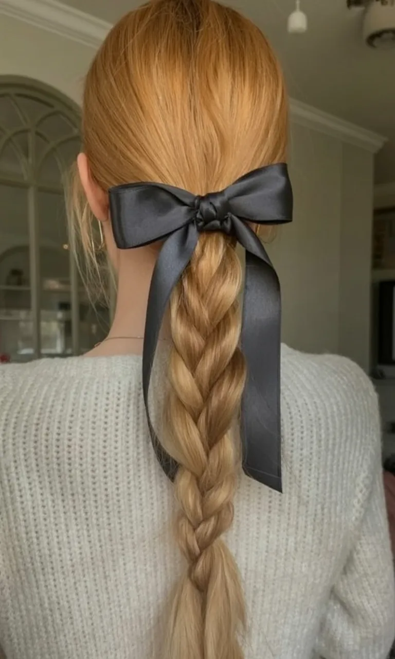 If low-maintenance beauty is your language, this one deserves attention. It is especially practical for women with long Hair, thick Hair, or second-day Hair because braids tend to hold better with a little texture. Just smooth the crown, create a classic braid, secure the ends, and tie on the Ribbon at the top for that finished look. Compared with loose waves or more decorative Half-up styles, this option feels cleaner and more secure, which makes it a great everyday choice. It is easy, flattering, and perfect when you want no-fuss style that still looks considered.