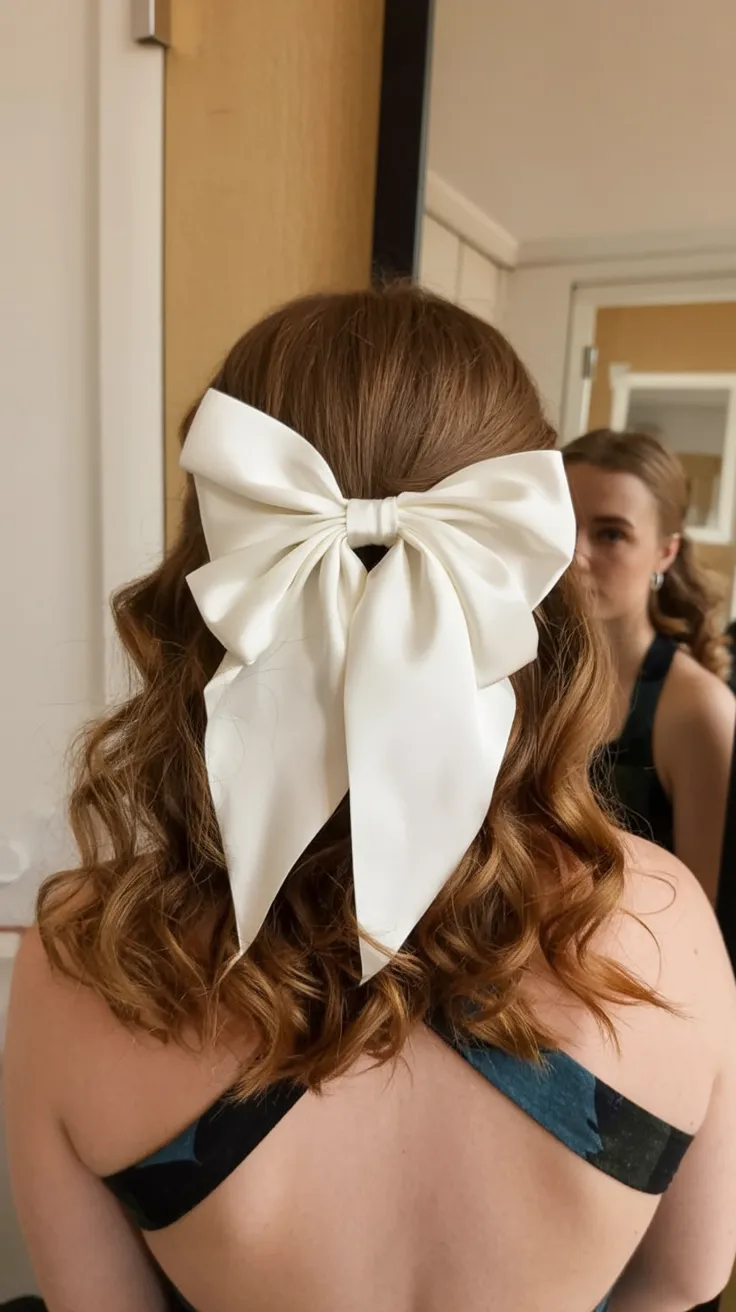 If you have been looking for inspiration to try a bow look without getting into complicated styling, this is a wonderful place to start. It suits straight to softly wavy. Hair and works best for long hair where the length can balance a larger Ribbon. All you really need is a smooth Half up section, a touch of serum through the ends, and a statement bow secured firmly at the back. Compared with braided or curled looks, this one feels more minimal and airy, which makes it especially lovely for women who want elegance with very little effort.