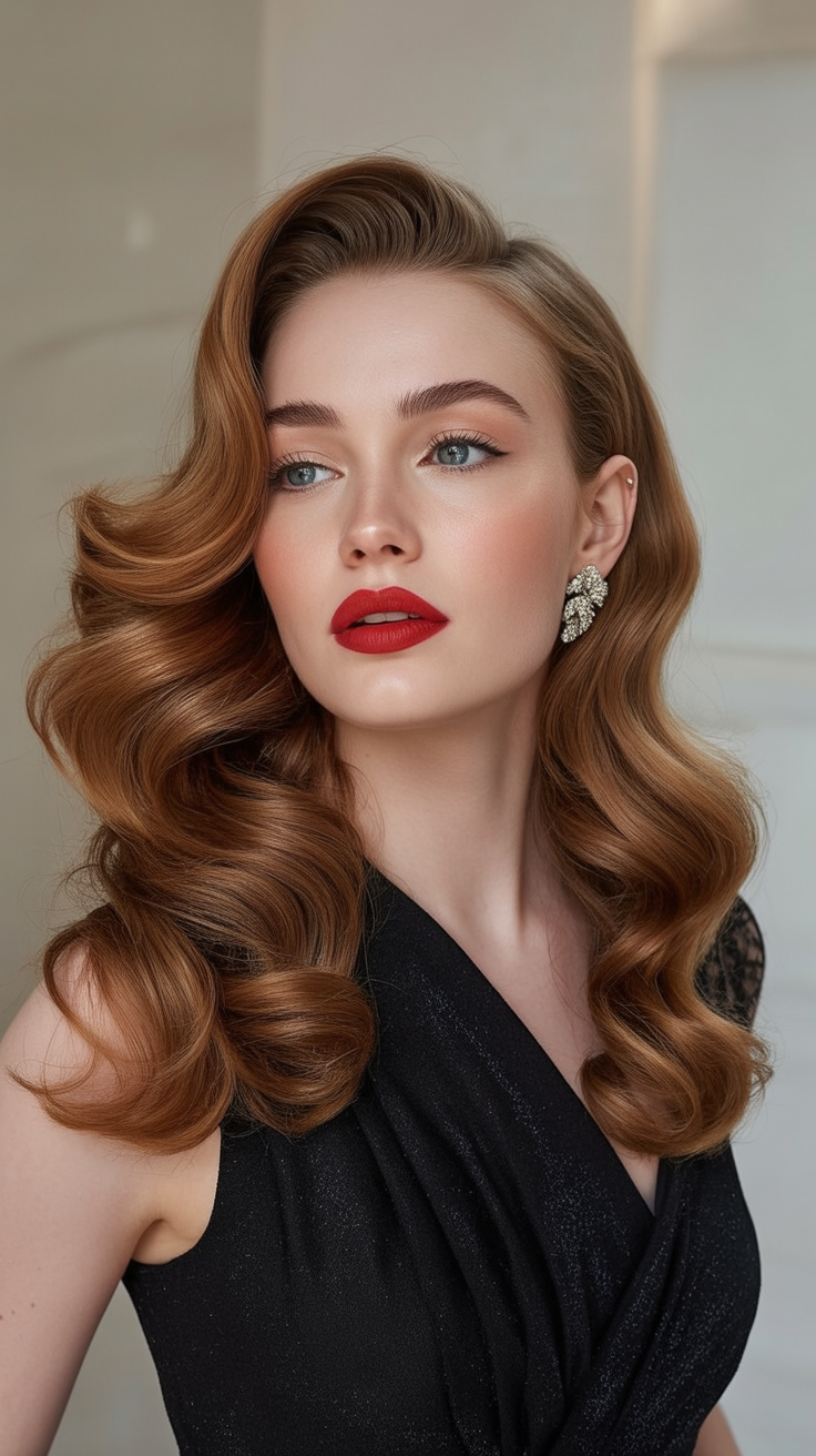 Old-Hollywood curls with red lips for a Christmas gala event. The smooth sculpted waves can only speak of confidence and grace.