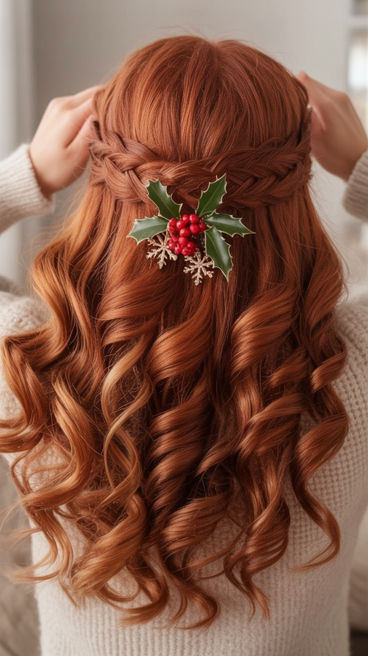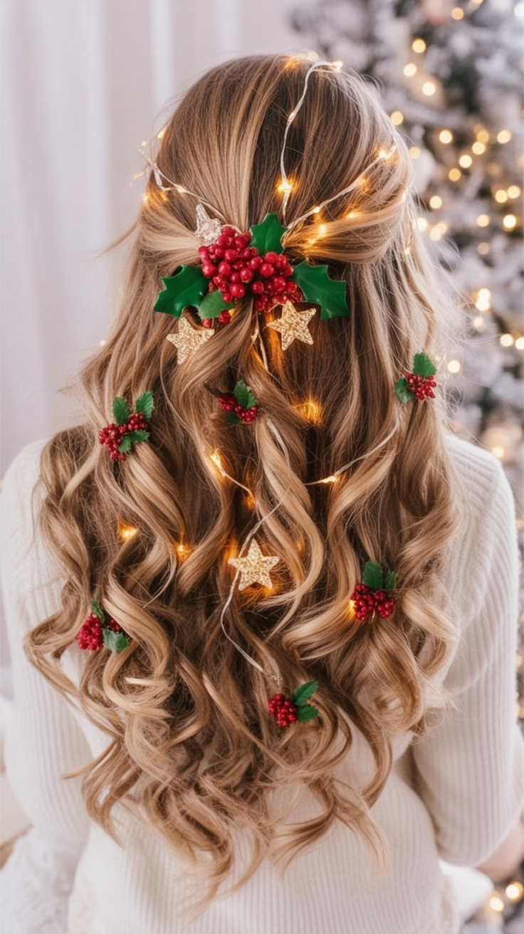 Soft, soft waves threaded with golden stars and small holly berries make this half-up hairstyle a Christmas dream. The curls cascade on the glow of the fairy lights, creating a very romantic, almost storybook atmosphere, perfect for holiday dinners or caroling nights.