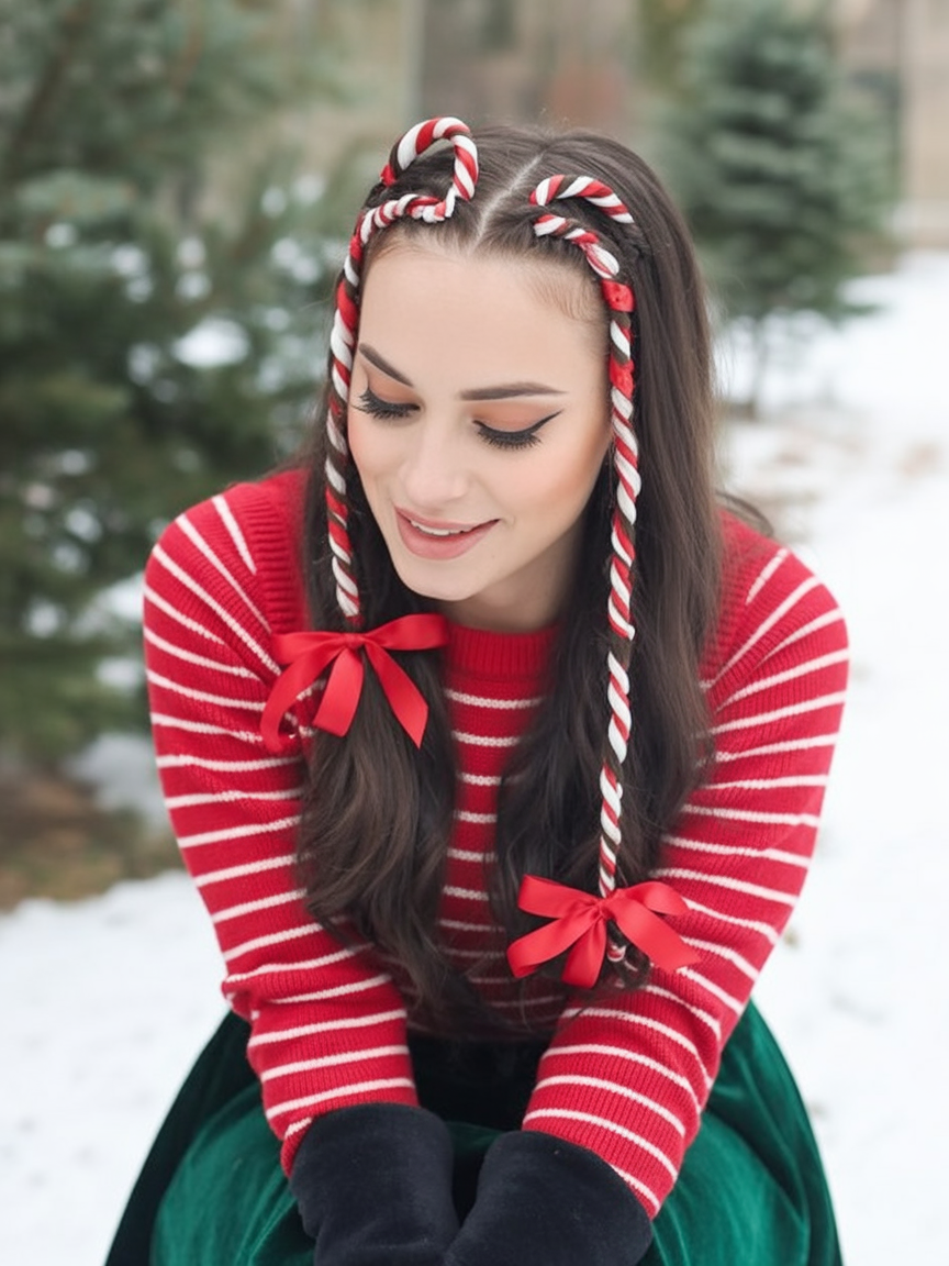 Inject fun into your look with candy-cane pigtails. Twisted red-and-white ribbons hug the strands, making the style sweet and playful—just the thing for Christmas morning or a themed get-together.