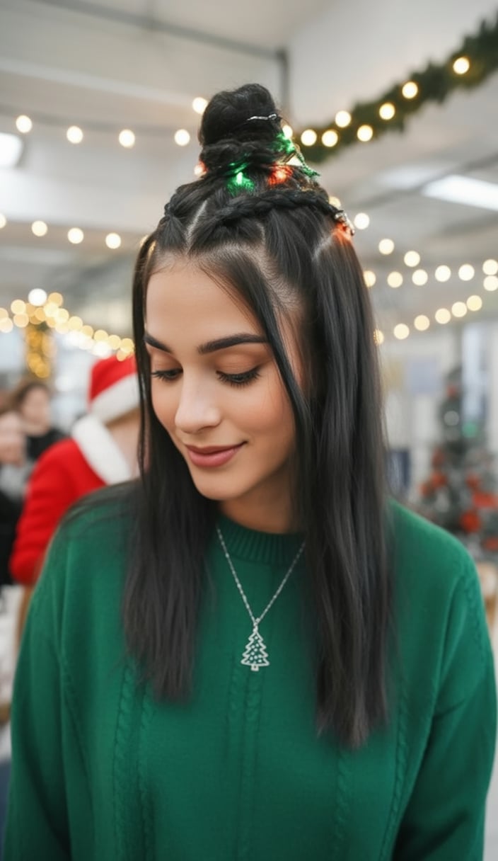 Perfect for straight or slightly wavy hair, this half-up bun adds height and personality. Use lightweight LED strands to decorate the knot, and keep the rest smooth with a flat iron or shine serum. It’s a quick, creative pick for holiday gatherings.