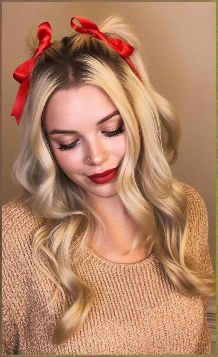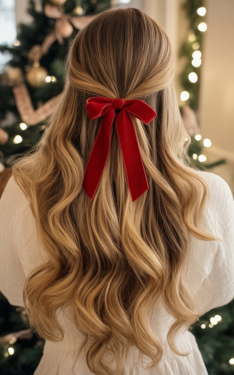 For a timeless finish, this sleek half-up style with a neat red bow is hard to beat. It’s graceful and minimal, letting your outfit or makeup shine.