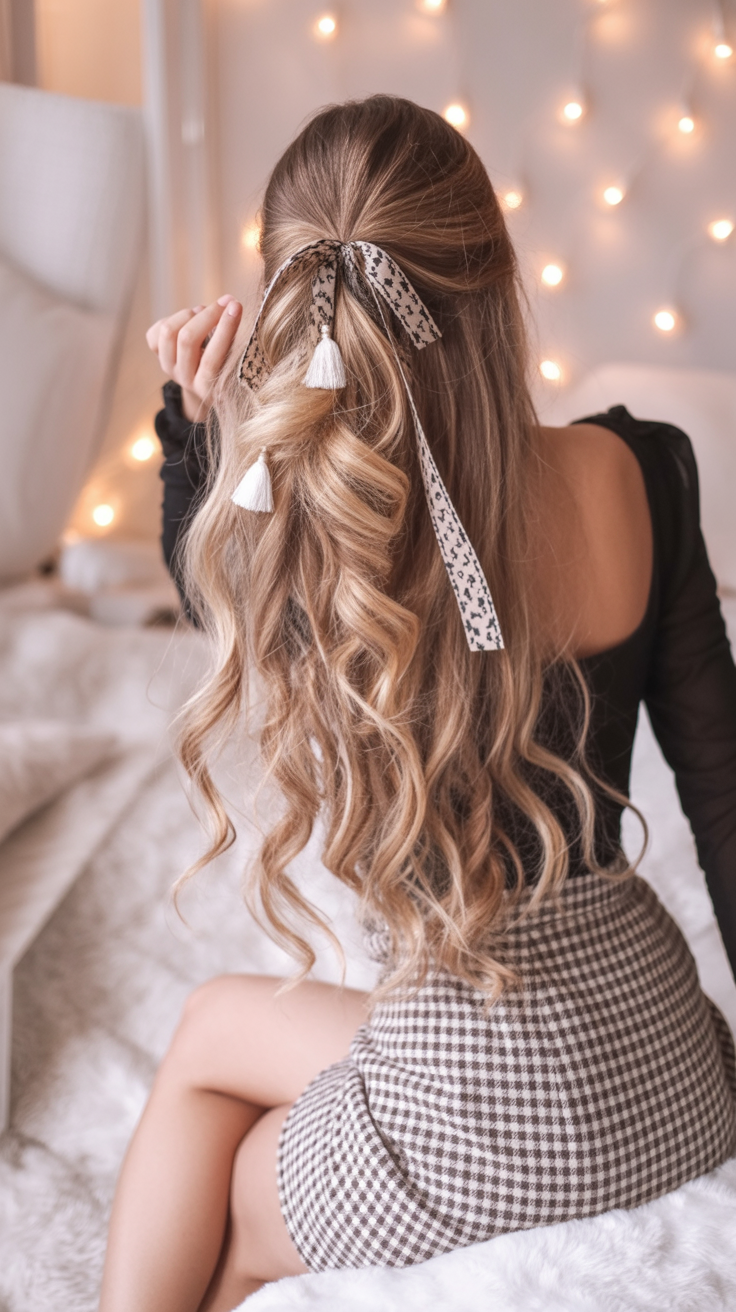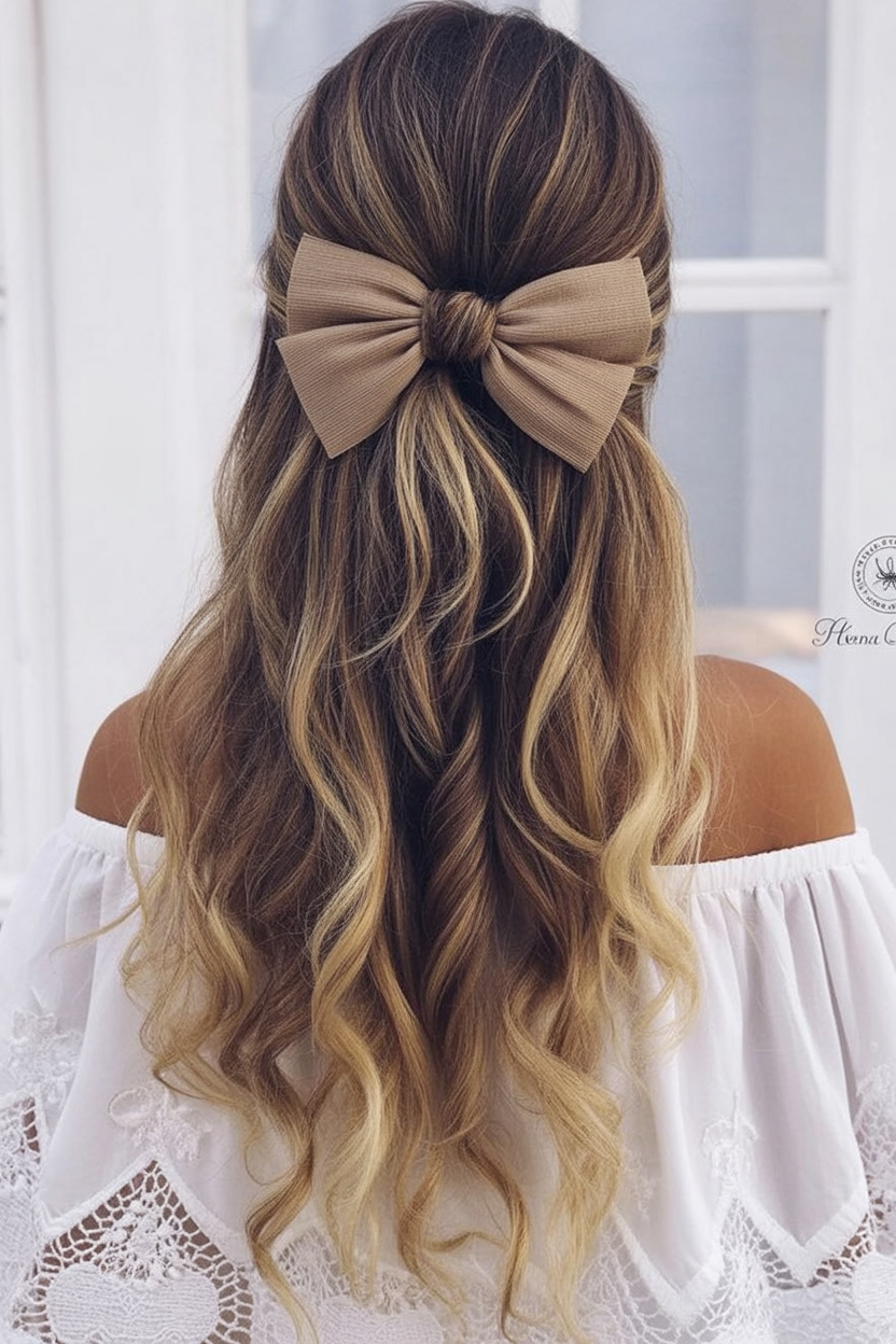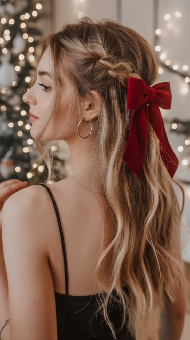 This works well on straight or softly curled hair. Gather the top section, smooth flyaways, and tie with a velvet bow. It’s a versatile, no-fuss choice.