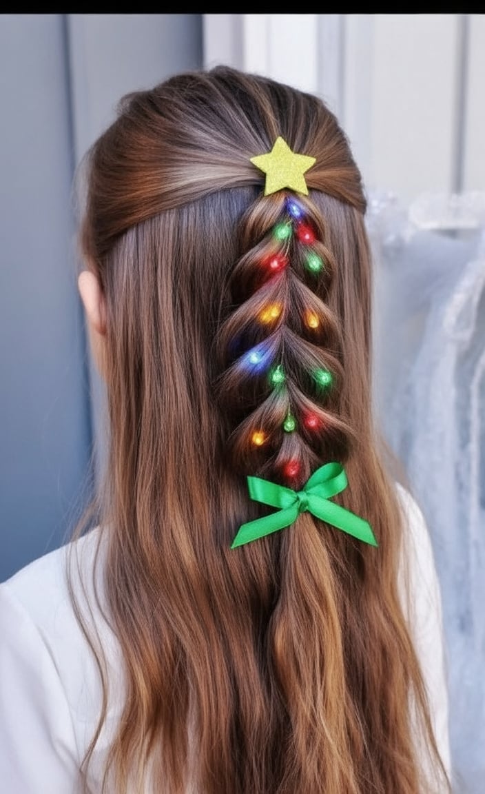 Shaped like a Christmas tree, this braid adorned with colorful lights is a playful surprise. The design feels fresh and charming, perfect for kids or anyone wanting to add some whimsy to their style.
