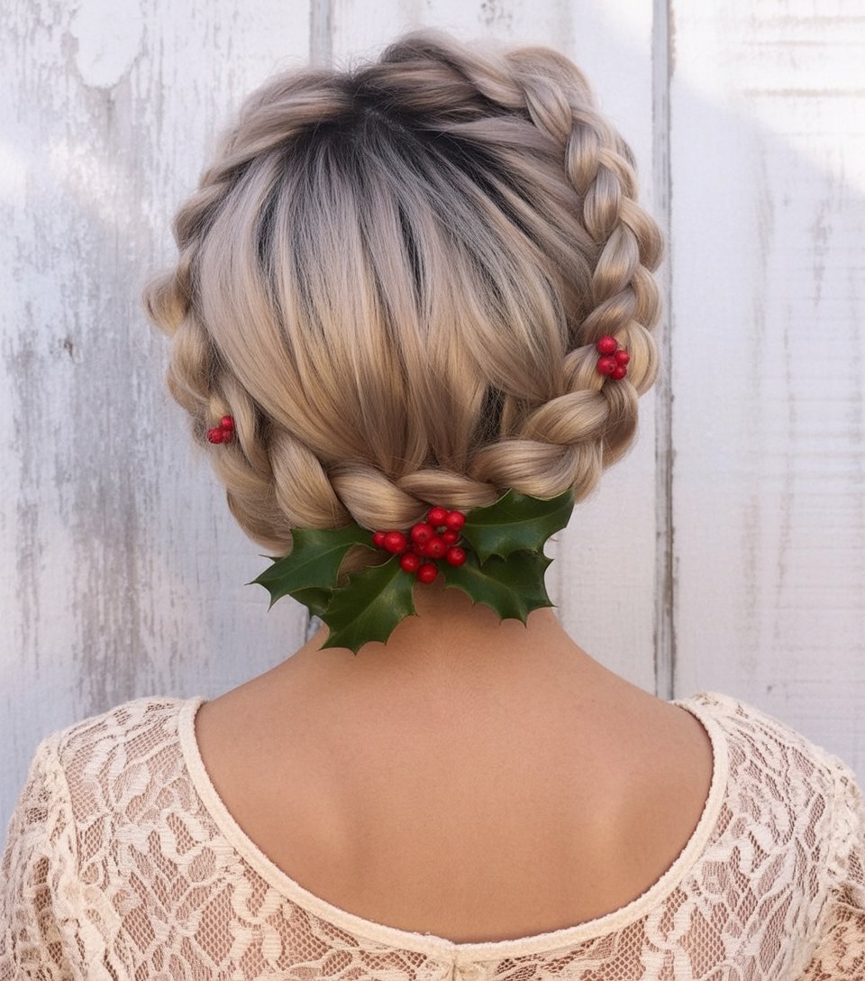 This style is good for straight or slightly wavy hair. Braid on each side from the front and pin in the back. Finish with will-they-drop-kicks-holly sprigs for that neat natural touch.