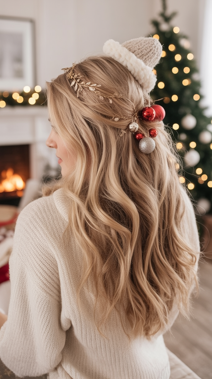 Long enough for wavy hair works best. Pin a small section at the crown, sort out some ornaments, and keep things light with a thin headband or hat. Super easy seasonal cheer with minimal upkeep.