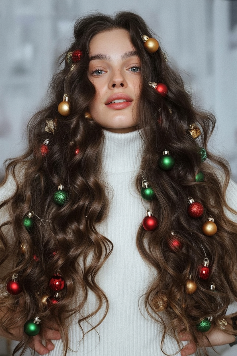 Gorgeously glossy waves decorated with little ornaments turn your hair into a full holiday extravaganza. The combination of red, gold, and green baubles emits audacious spirit — just right for parties or a fun day full of photos.