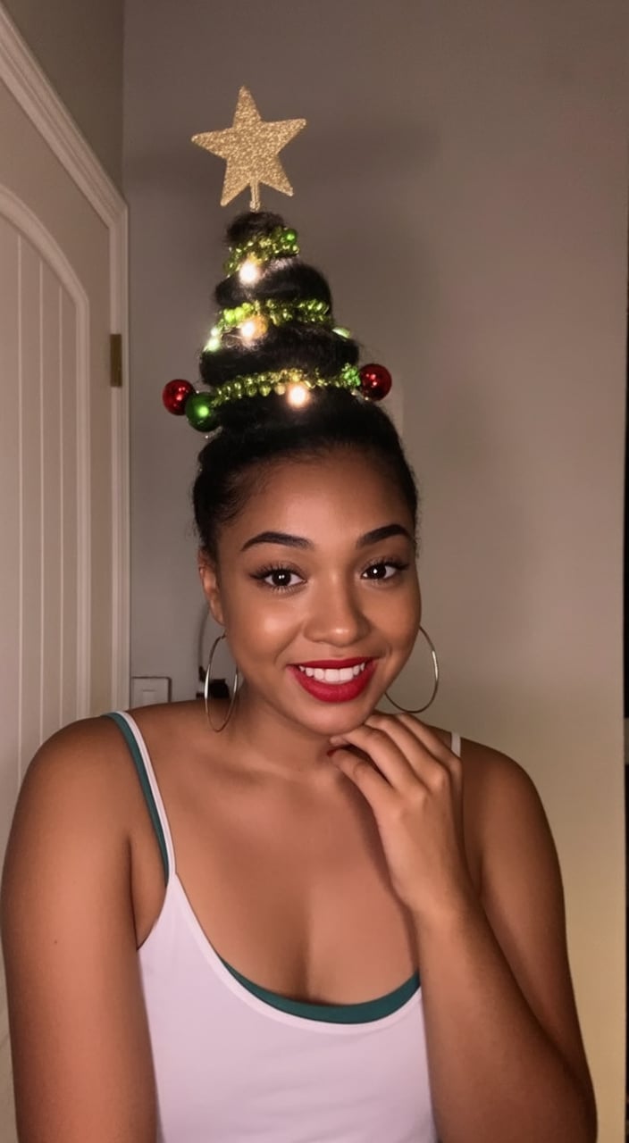 This cheerful look features a small top knot wrapped in twinkling lights, while the rest of the hair falls sleek and glossy. It’s a fun way to keep things tidy while leaning fully into the Christmas spirit.