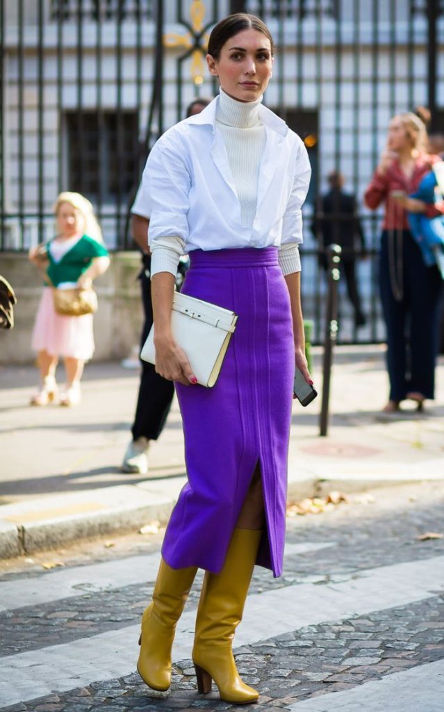 A purple pencil skirt paired with a crisp white button-down layered over a ribbed turtleneck creates a visually striking yet polished look. This ensemble plays with layering, making it ideal for work business or transitioning between seasons. The mustard yellow boots add a playful contrast, proving that bold color combinations can be both stylish and sophisticated.