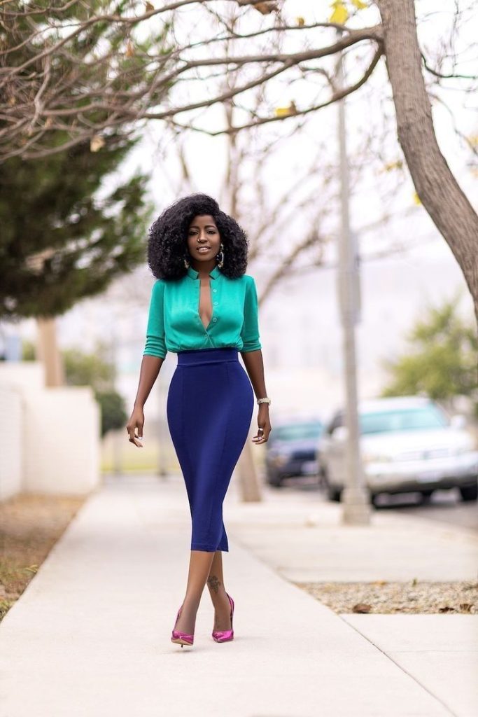 A deep navy blue pencil skirt with a high-waisted fit complements a rich emerald silk blouse, creating an effortlessly classy ensemble. The form-fitting skirt elongates the legs, while the blouse adds fluidity to the look. Paired with pink heels, the unexpected color pop elevates the style.